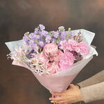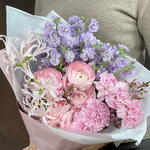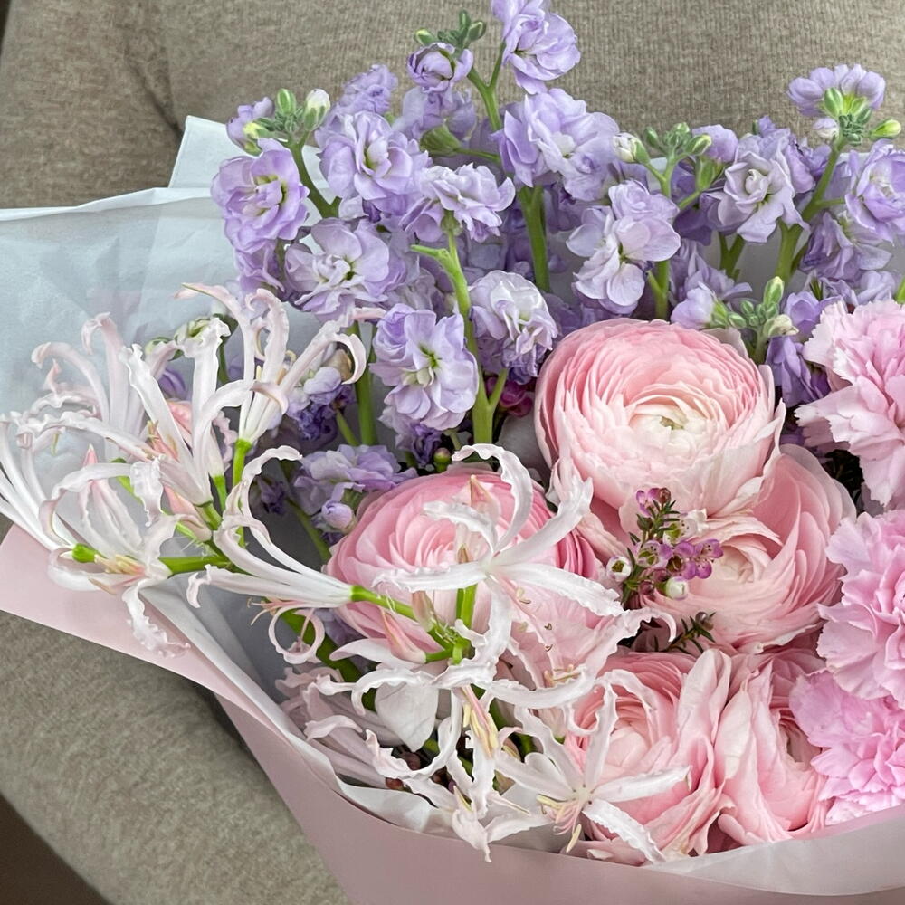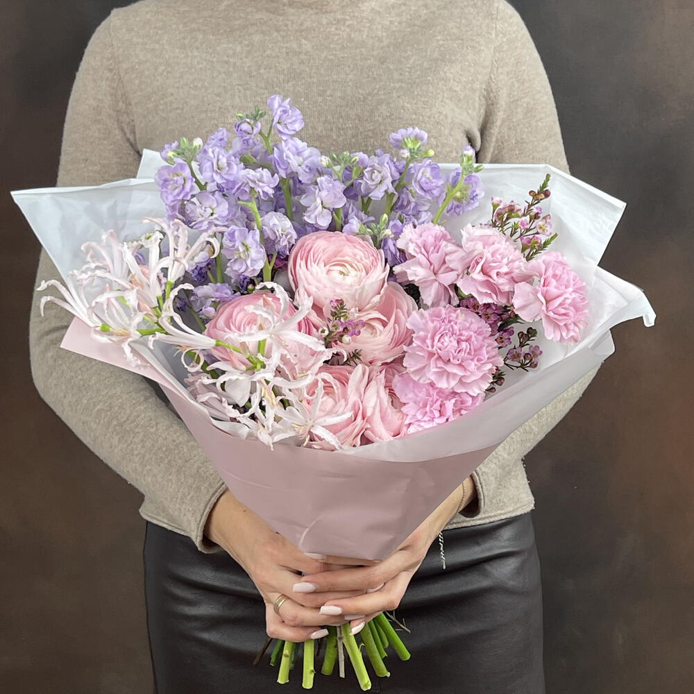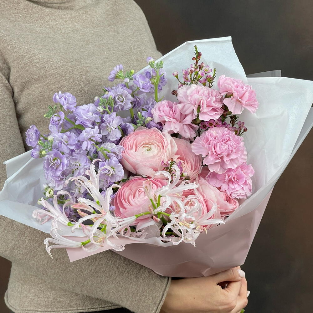Маттиола - 3 шт. Гвоздика - 5 шт. Хамелациум - 2 шт. Ранункулюс - 5 шт. Упаковка дизайнерская - 1 шт. Нерина - 3 шт.