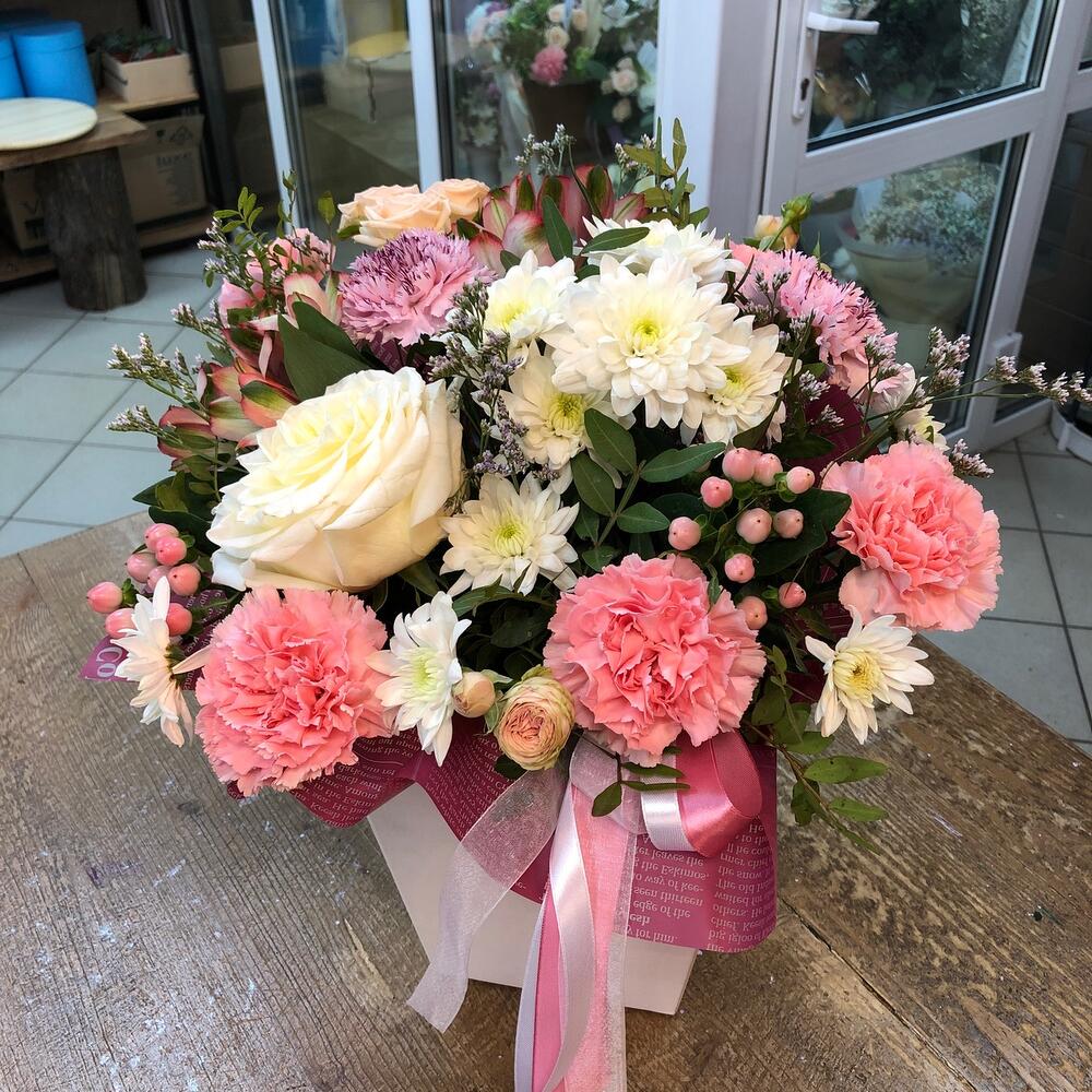 Альстромерия - 2 шт. Гиперикум - 2 шт. Лимониум - 1 шт. Писташ - 2 шт. Роза кустовая - 1 шт. Хризантема кустовая - 2 шт. Гвоздика - 7 шт. Оазис флористический - 1 шт. Роза премиум - 1 шт. Трапеция - 1 шт.