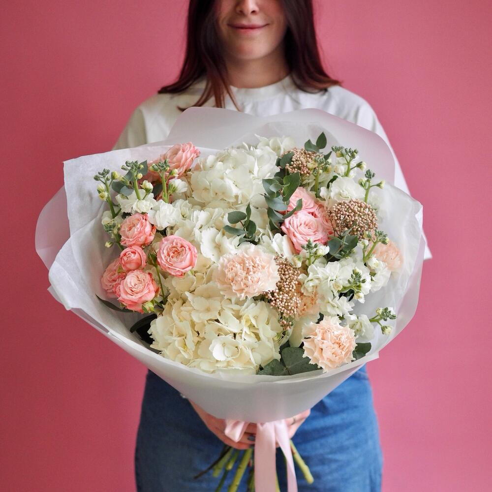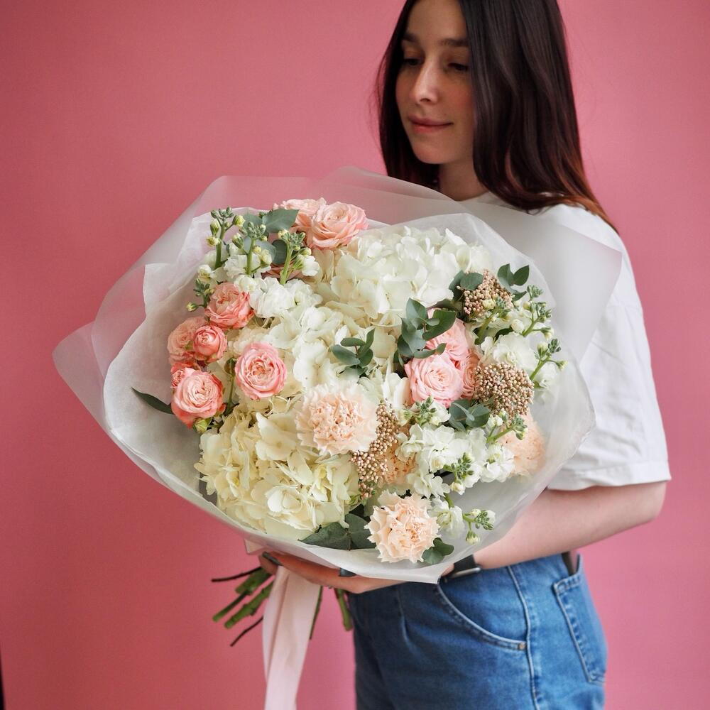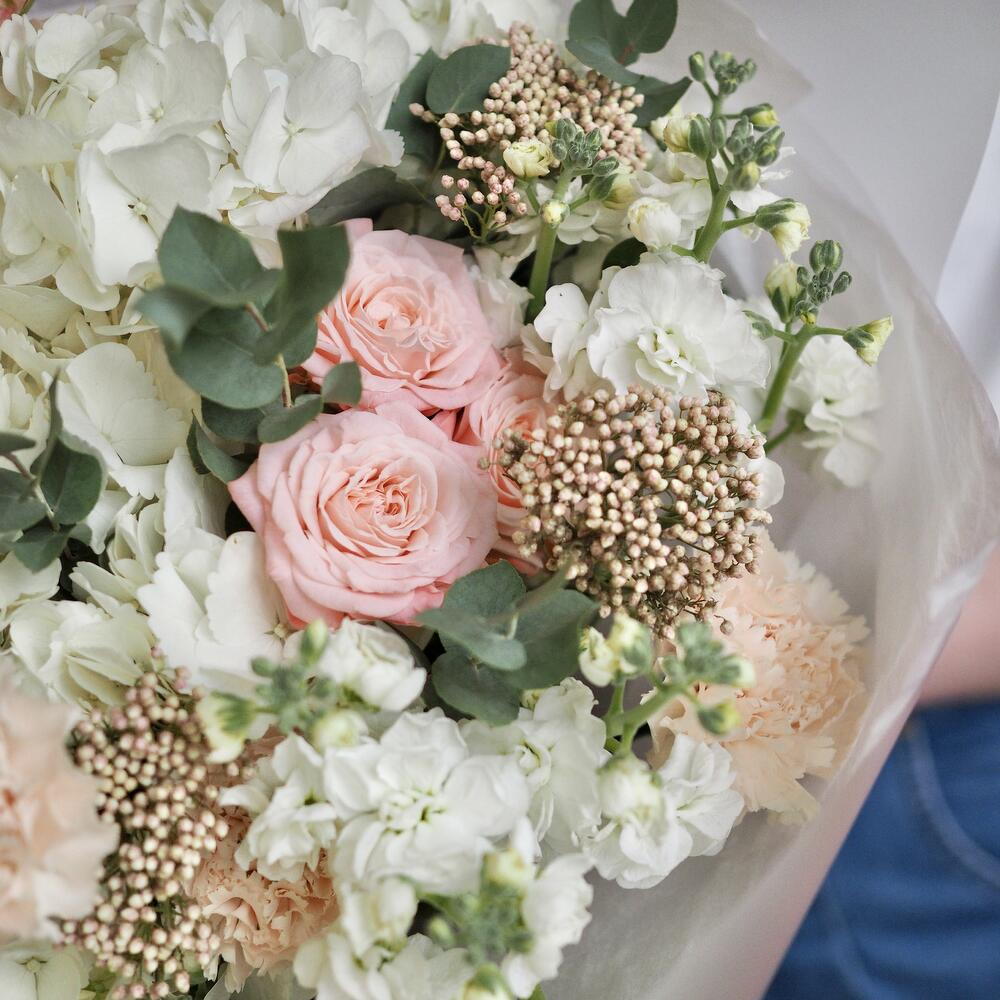 Волшебный сад с гортензией маттиолой и кустовой розой Романтичный букет из гортензий, ароматной маттиолы, озотамнуса, кустовой розы и гвоздик. Сборка букета осуществляется по технике «спираль», что придает ему естественность и живость. Букет оформлен в многокомпонентную упаковку, которая придает особый шарм и защищает цветы от внешних воздействий. Отличный подарок на День Святого Валентина. ✨ Состав: Гвоздика кремовая - 3 шт. Маттиола - 4 шт. Озотамнус - 3 шт. Роза кустовая - 3 шт. Эвкалипт - 2 шт. Гортензия белая - 3 шт. Дизайнерская упаковка - 1 шт. Преимущества, при заказе букета в нашем магазине – вы получите: - Свежие цветы премиум-качества - Красивая и стильная упаковка с в современном стиле - Быстрая доставка цветов по Всей Москве. 💫 Кому преподнести букет: любимой девушке, супруге, невесте, маме, матери, коллеге, учителю, сестре, жене, любимой девушке Цветочный магазин, букет цветов, французские розы, доставка цветов, цветы с доставкой, заказать цветы, купить цветы, доставка цветов Москва, цветы Москва, заказ цветов Москва, fmart, flowwow,,доставкацветовмосква, цветымосква, быстраядоставка, доставкаонлайн, подарокдлялюбимой, дарисмело, дляродныхилюбимых, цветы, флористика, цветочныймагазин, заказатьбукетонлайн, цветыбыстро, цветиисияй, деньрождения, подарокнагодовщину, подарокнасвадьбу, цветыдлядевушки, цветыдлямамы, цаетыдляколлеги, цветыдлябабушки, цветыдлясестры, доставкацветовповсеймоскве, радуйлюбимых, дарилюбовь, длявлюблённых, восьмоемарта, 8марта, деньматери, рождение, свадьбы, юбилей, деньроссии, пасха, 14февраля, деньфлагароссии, выпускные, выпускныеизшкол, выпускныеиздетсадов, деньсемьи, деньотца, деньсемьилюбвииверности, деньнезависимости, новыйгод, 1сентября, деньучителя, деньвоспитателя, 1мая, праздниквесныитруда