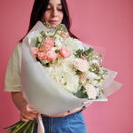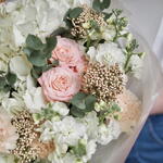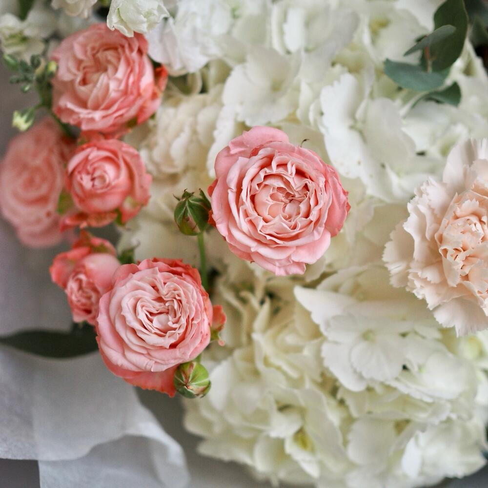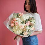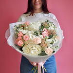 Гортензия - 3 шт. Маттиола - 4 шт. Эвкалипт - 2 шт. Упаковка - 1 шт. Диантус - 3 шт. Роза кустовая пионовидная - 3 шт.