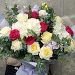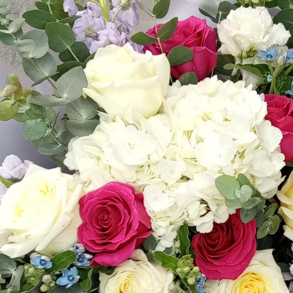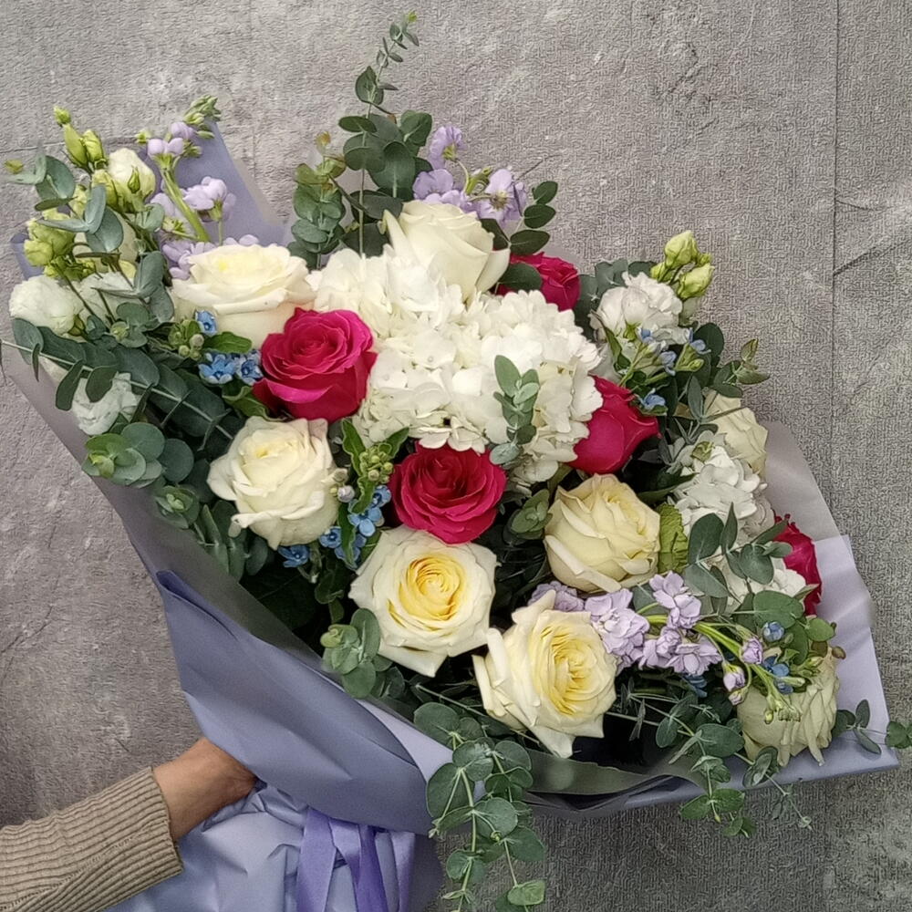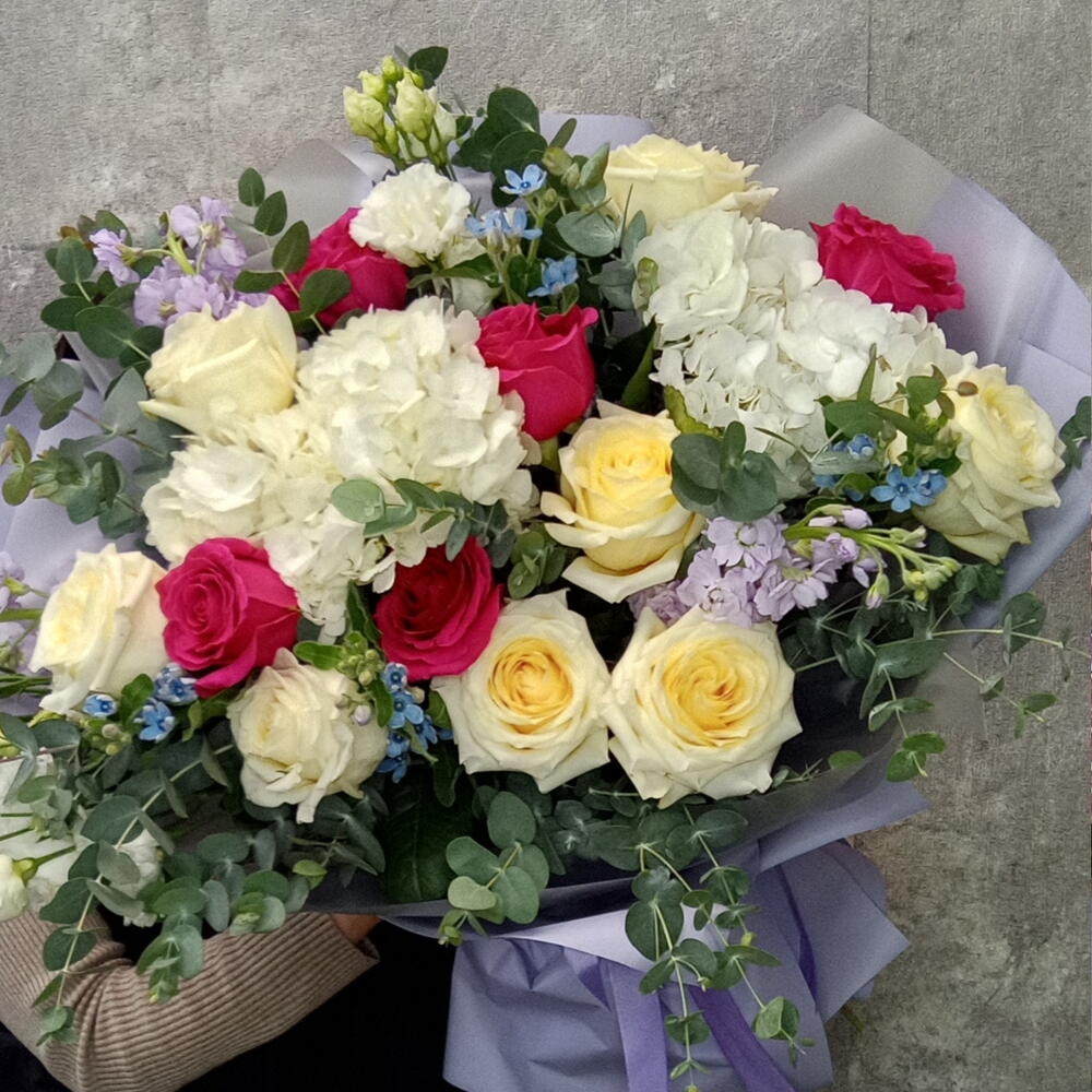 Объёмный букет с розами эквадор, гортензиями, нежными голубыми цветочками оксепиталума, эустомой и ароматным эвкалиптом.Подойдет по любому поводу и на любой случай в качестве подарка, знака внимания и благодарности. Подойдет коллегам, мамам, бабушкам, родственникам, вторым половинкам, подругам , друзьям,бизнес партнёрам, медицинским работникам, для первого свидания.цветы следует подрезать перед тем , как ставить в вазу с водой. На доставку бережно упаковываем 🤗.