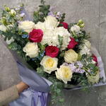 Гортензия - 2 шт. Роза Эквадор - 11 шт. Упаковка - 8 шт. Эустома - 5 шт. Лента атласная - 3 шт. Оксипеталум - 5 шт. Эвкалипт пучок - 1 шт. Маттиола Лавандовая - 3 шт.