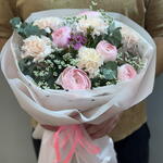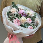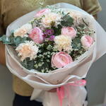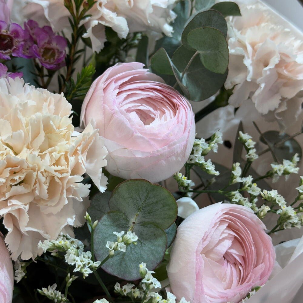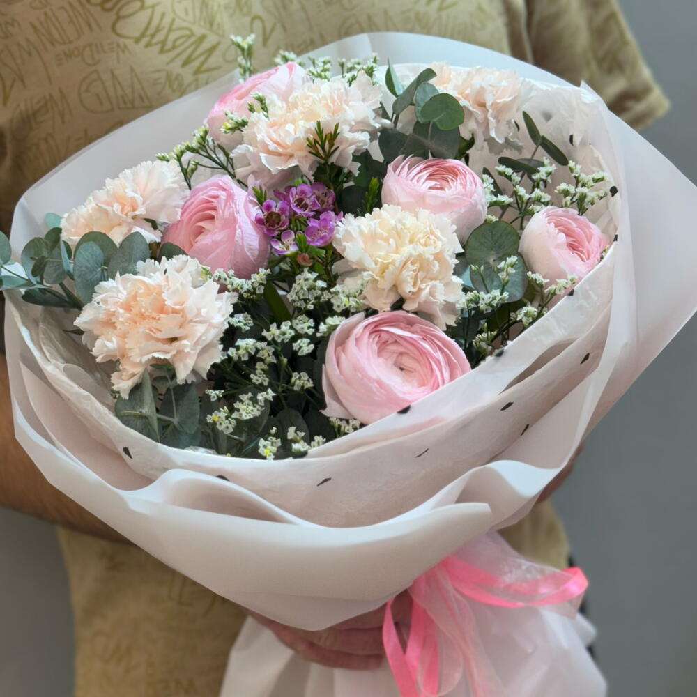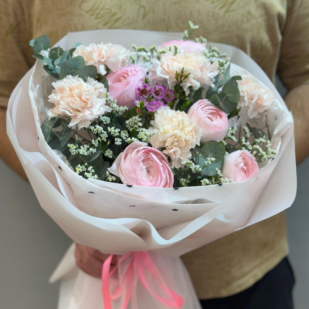 Нежный и стойкий букет из сезонных ранункулюсов, диантусов, воздушных белоснежных веточек лимониума и ароматного хамелациума. Настоящая весна, собранная в милый букет для самого близкого и родного человека. Такой букет станет отличным подарком на 14 февраля, 8 марта, День Рождения.