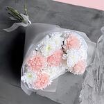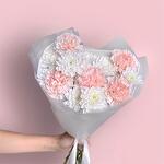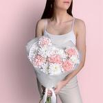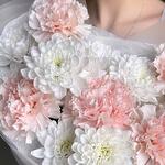 Нежный букет комплимент в пастельных тонах из белой кустовой хризантемы и розового диантуса :) Не забудьте подрезать цветы непосредственно перед тем как ставить в вазу. Не храните букет на прямых солнечных лучах и возле отопительных приборов, чтобы сохранить цветы свежими как можно дольше. Обратите внимание на написанные размеры букета и фото в полный рост с человеком, для понимания размера композиции :)