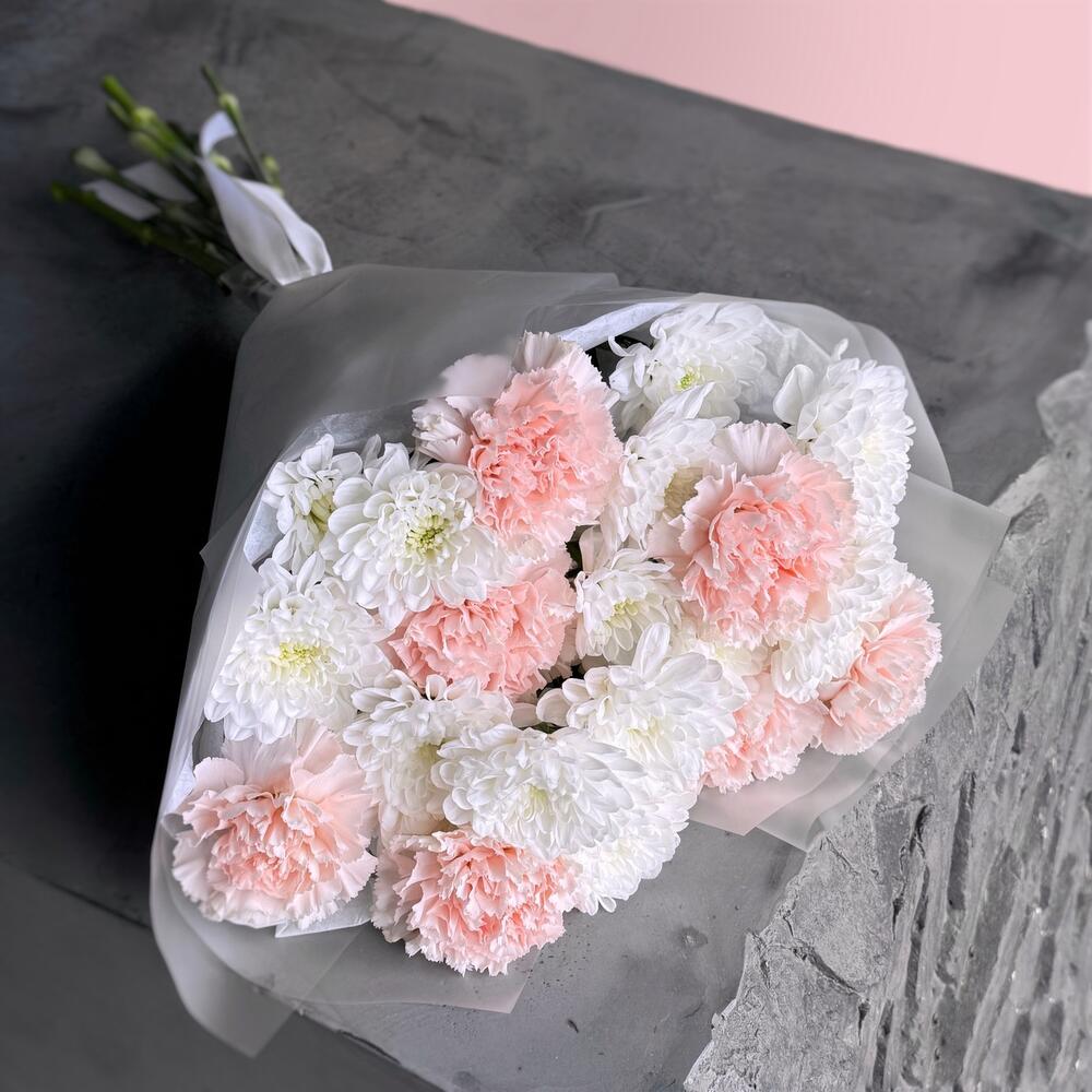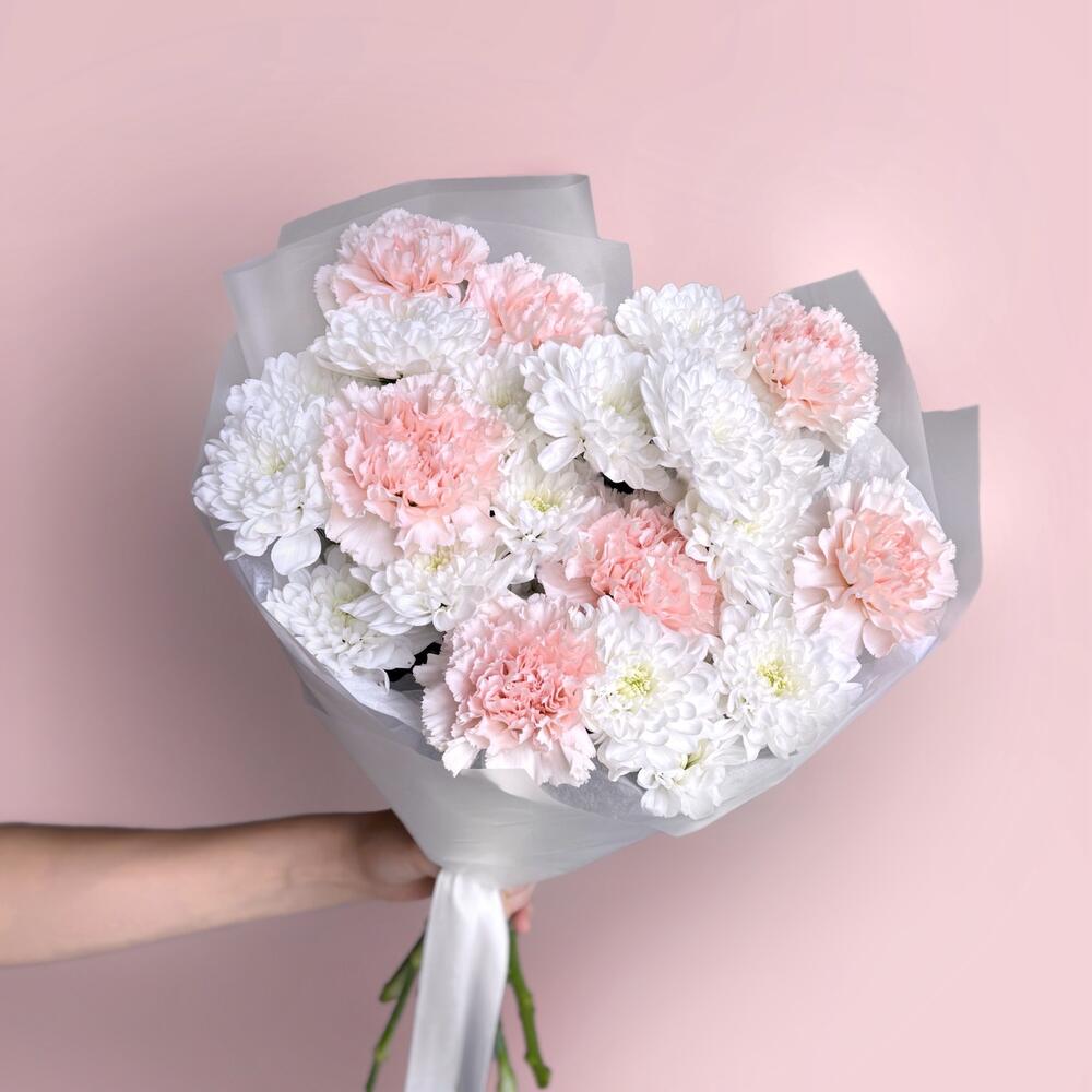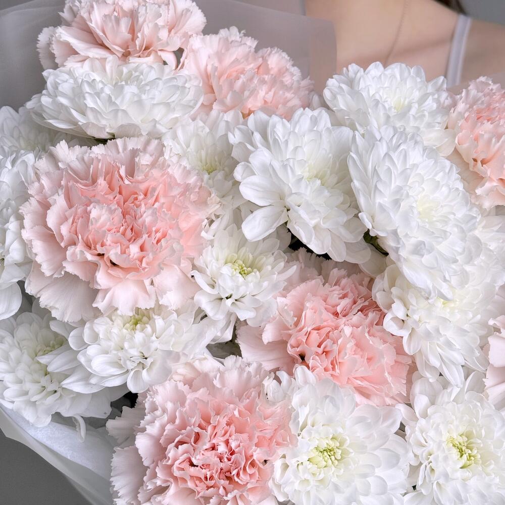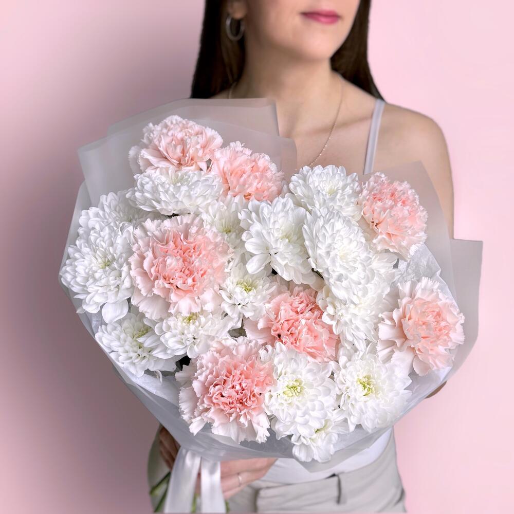 Воздушный нежный букет розовый диантус и кустовая хризантема