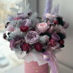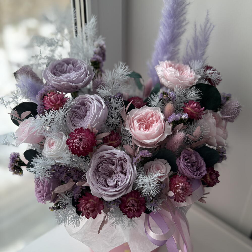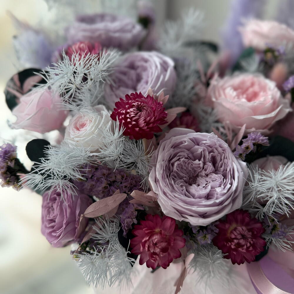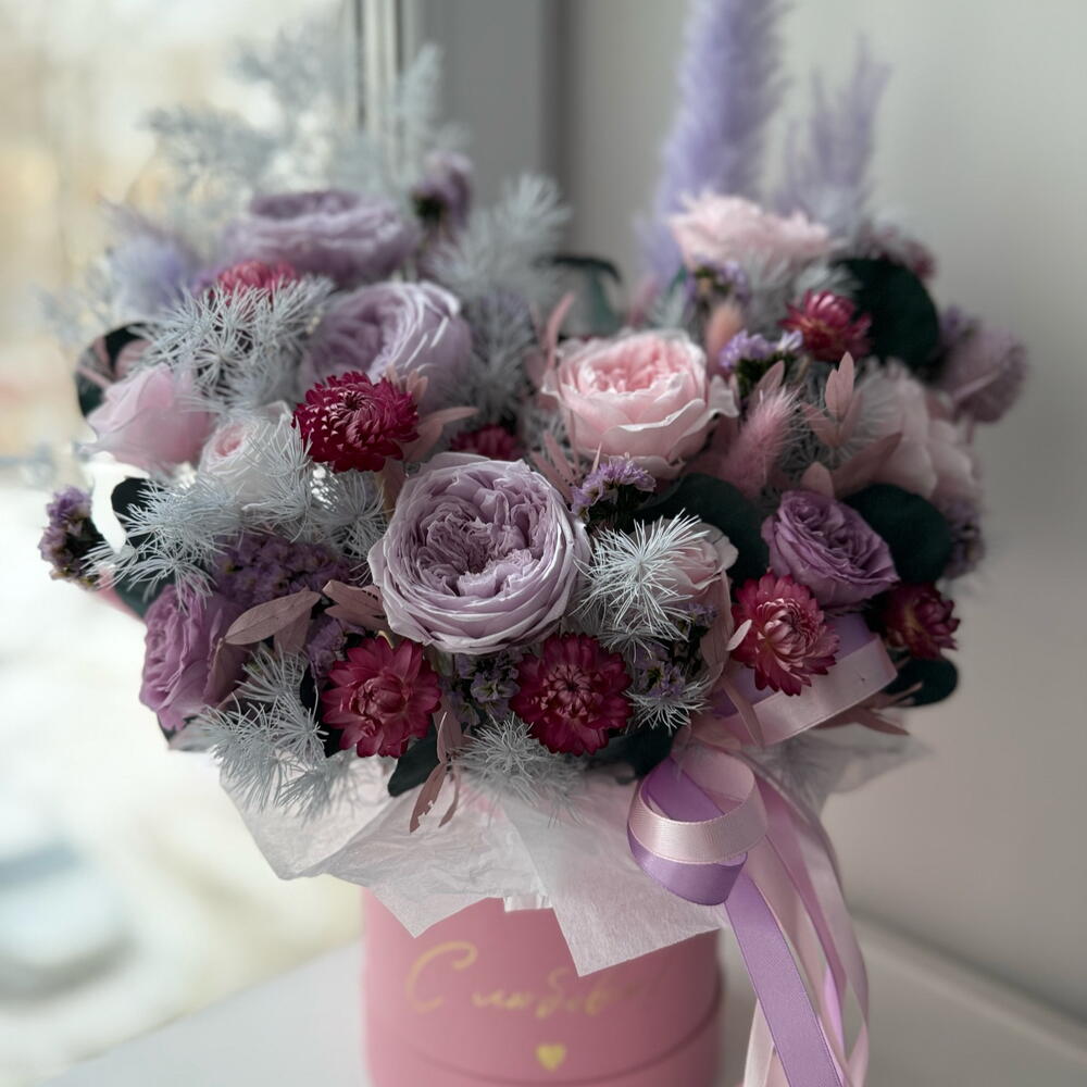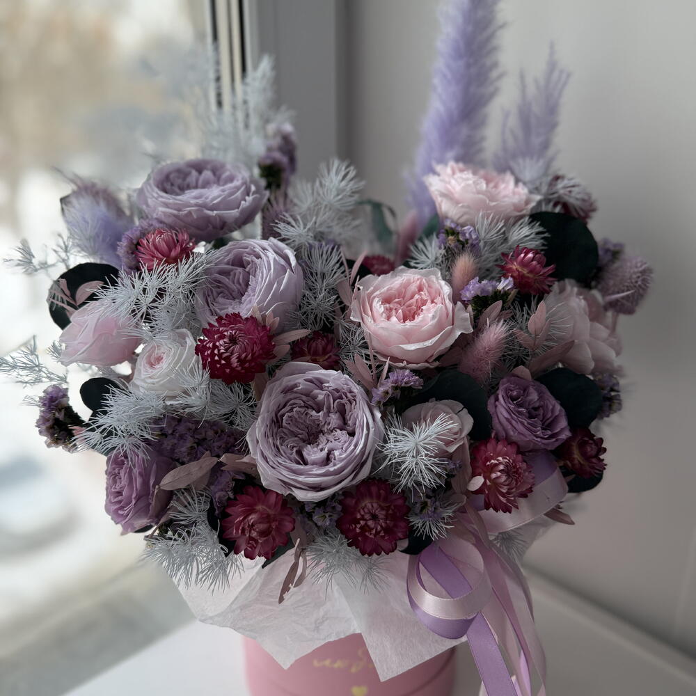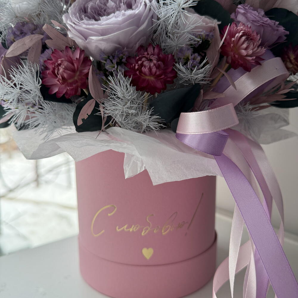 Лента атласная - 3 шт. Коробка шляпная - 1 шт. Лагурус - 7 шт. Оазис флористический - 1 шт. Гелихризум - 16 шт. Эвкалипт стабилизированный - 2 шт. кардус - 5 шт. пампасная трава - 3 шт. роза пионовидная стабилизированная - 6 шт. аспарагус стабилизированный - 2 шт. статица стабилизированная - 3 шт. роза мини стабилизированная - 5 шт. эвкалипт стабилизированный розовый - 2 шт.
