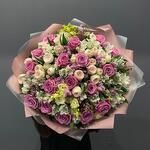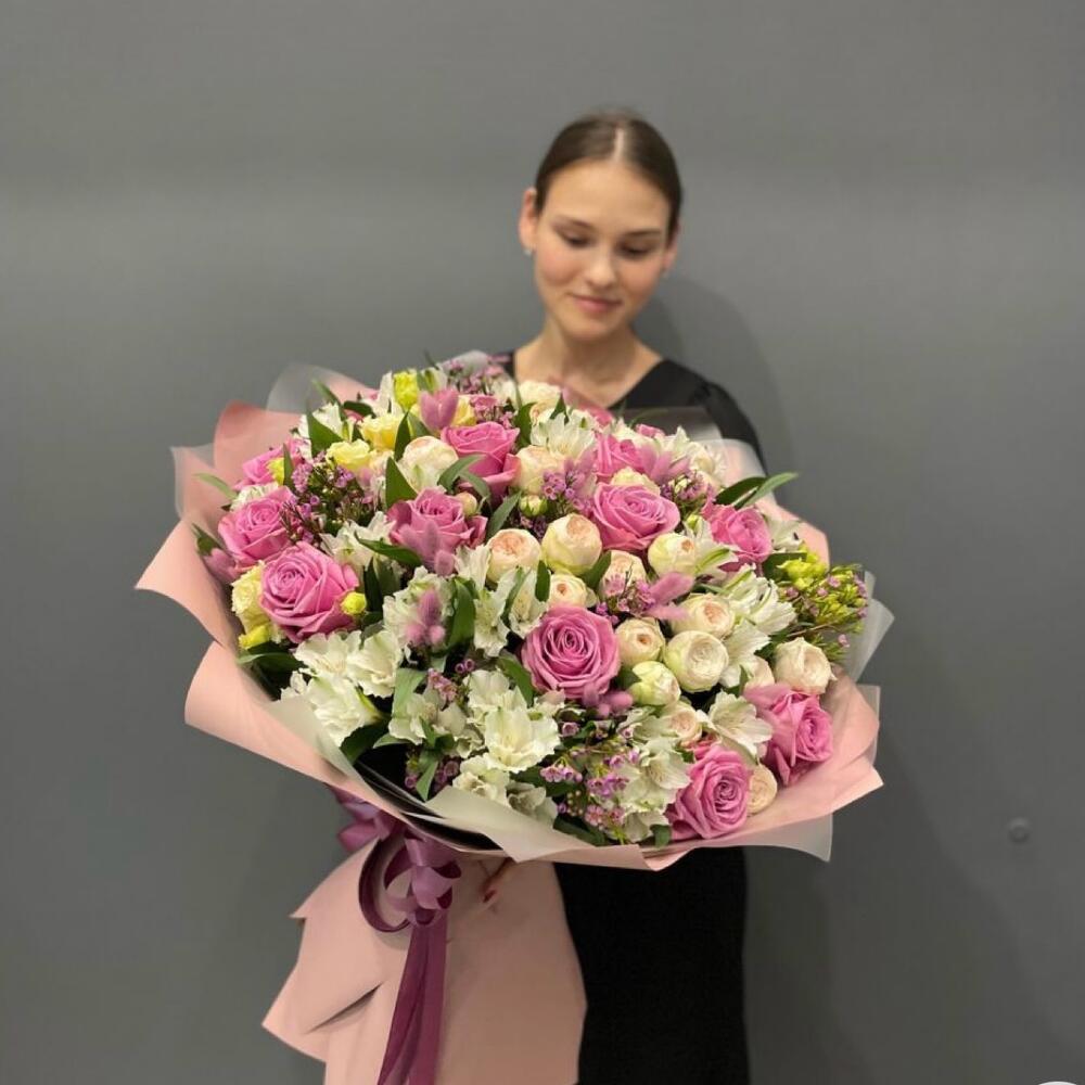 Огромное вам спасибо, продавец от себя добавил ещё цветов не включая в стоимость. Цветы свежие, самые лучшие, часть роз ещё не даже не успела распустить, а что значит они простоят не меньше недели