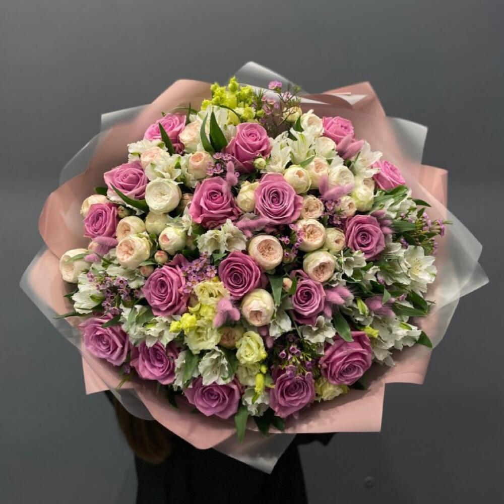 Альстромерия - 10 шт. Ваксфлауэр - 10 шт. Роза кустовая - 9 шт. Роза - 15 шт. Упаковка дизайнерская - 12 шт. Лагурус - 10 шт.