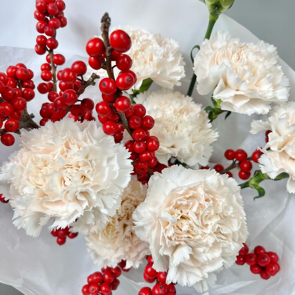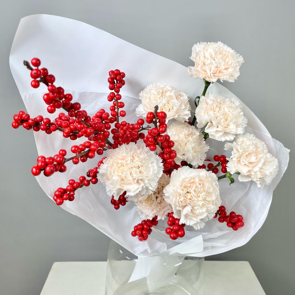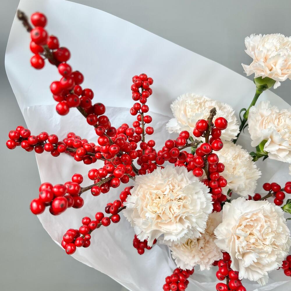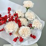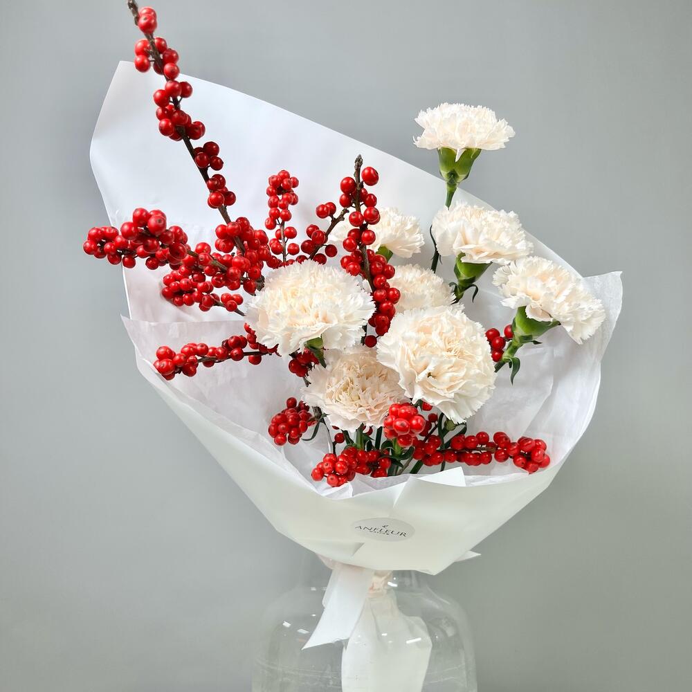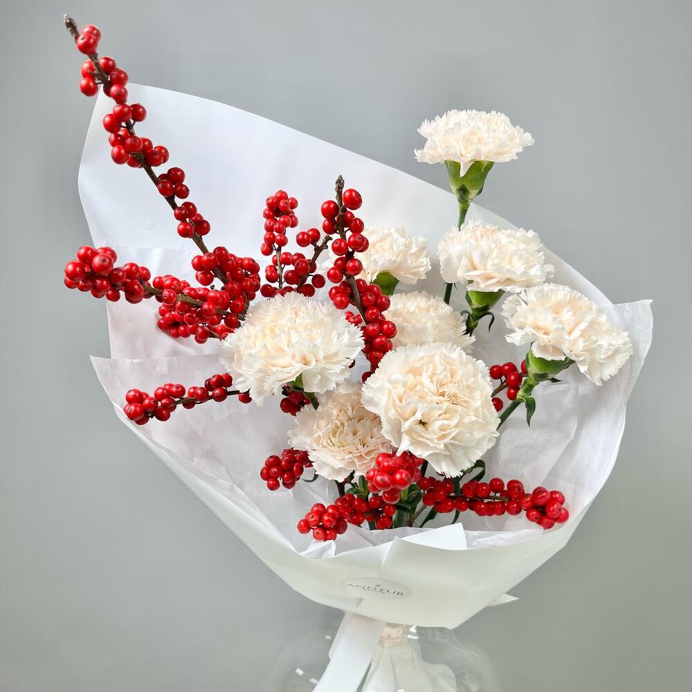 Лента атласная - 2 шт. Диантус - 8 шт. Упаковка дизайнерская - 1 шт. Открыточка с вашими пожеланиями - 1 шт. Илекс Красный - 2 шт. Транспортировочная коробка - 1 шт. подкормка для срезанных цветов - 1 шт. инструкция по уходу за цветами - 1 шт. аквапак с водой - 1 шт.