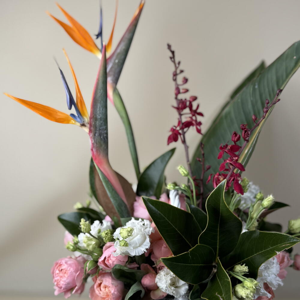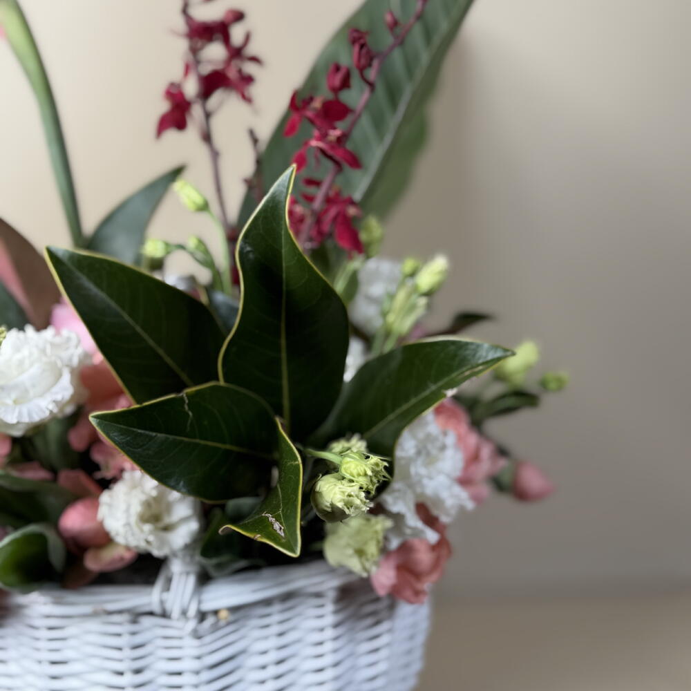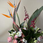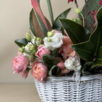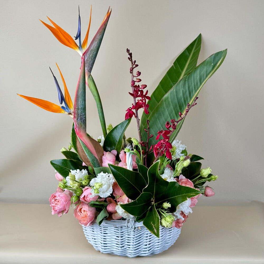 Роза кустовая - 7 шт. Стрелиция - 2 шт. Эустома - 7 шт. орхидея - 3 шт. Корзина плетеная - 1 шт. ветки магнолии - 3 шт. листья стрелиции - 2 шт.