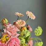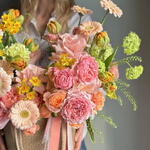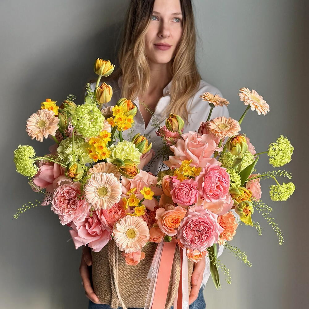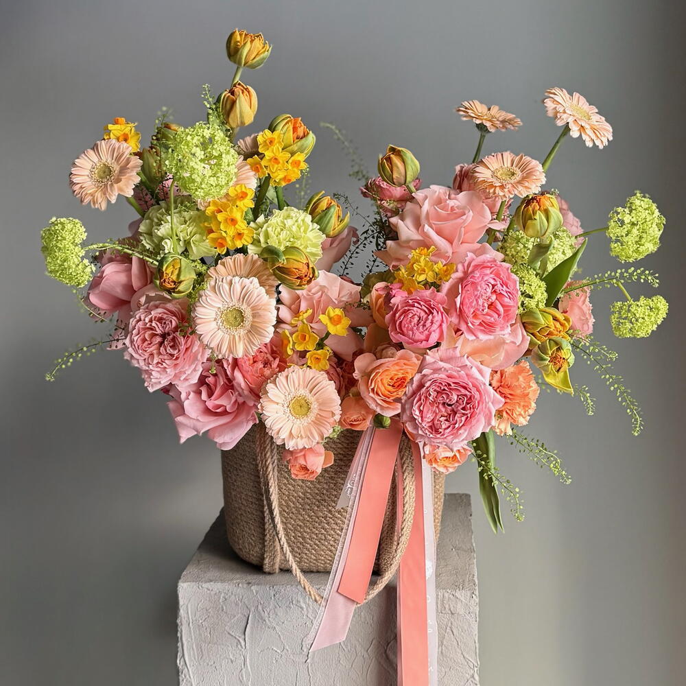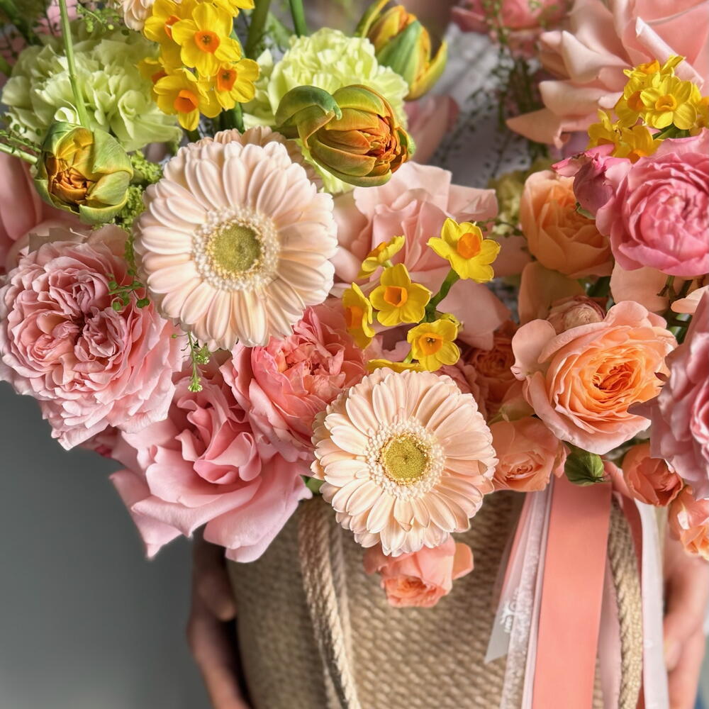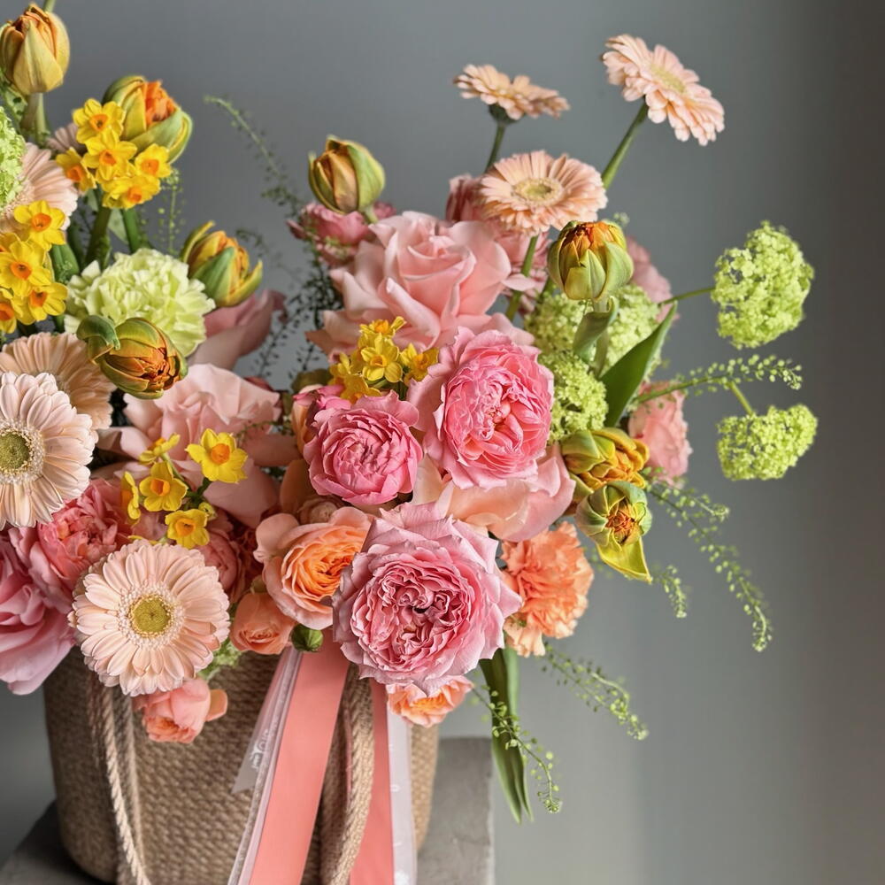 В центре композиции романтичные французские розы Бисвит и Джульетта, которые идеально сочетаются с яркими пионовидными тюльпанами и нежными нарциссами. А для объема в букете присутствуют зеленые шарики вибурнума и гринбелл. Благодаря тому, что этот букет оформлен в плетеной корзине, он создаст дополнительный уют и подойдет для любого интерьера. Цветы - это живые и хрупкие создания. Чтобы они радовали Вас дольше не забывайте ежедневно ухаживать за композицией 💚 Оформляя заказ у нас Вы выбираете уникальность, качество, заботу и быструю бережную доставку цветов до адреса Вашего близкого человека по любому случаю, будь то день рождения, профессиональный праздник, торжество или комплимент без повода. В нашей цветочной мастерской Вы найдёте богатый выбор букетов, композиций, корзин и шляпных коробок с такими цветами как французская роза, ранункулюс, гортензия, хризантема, гвоздика (диантус), гербера, кустовая и пионовидная роза, которым аккомпанирует эвкалипт, молюцелла, вибурнум, писташ. В состав наших букетов и композиций входят самые интересные сорта из Голландии, Италии, Эквадора, Колумбии и других плантаций разных стран, а также локальные фермерские цветы премиального качества, которые смогут выразить Ваши самые глубокие, тëплые или смелые чувства.