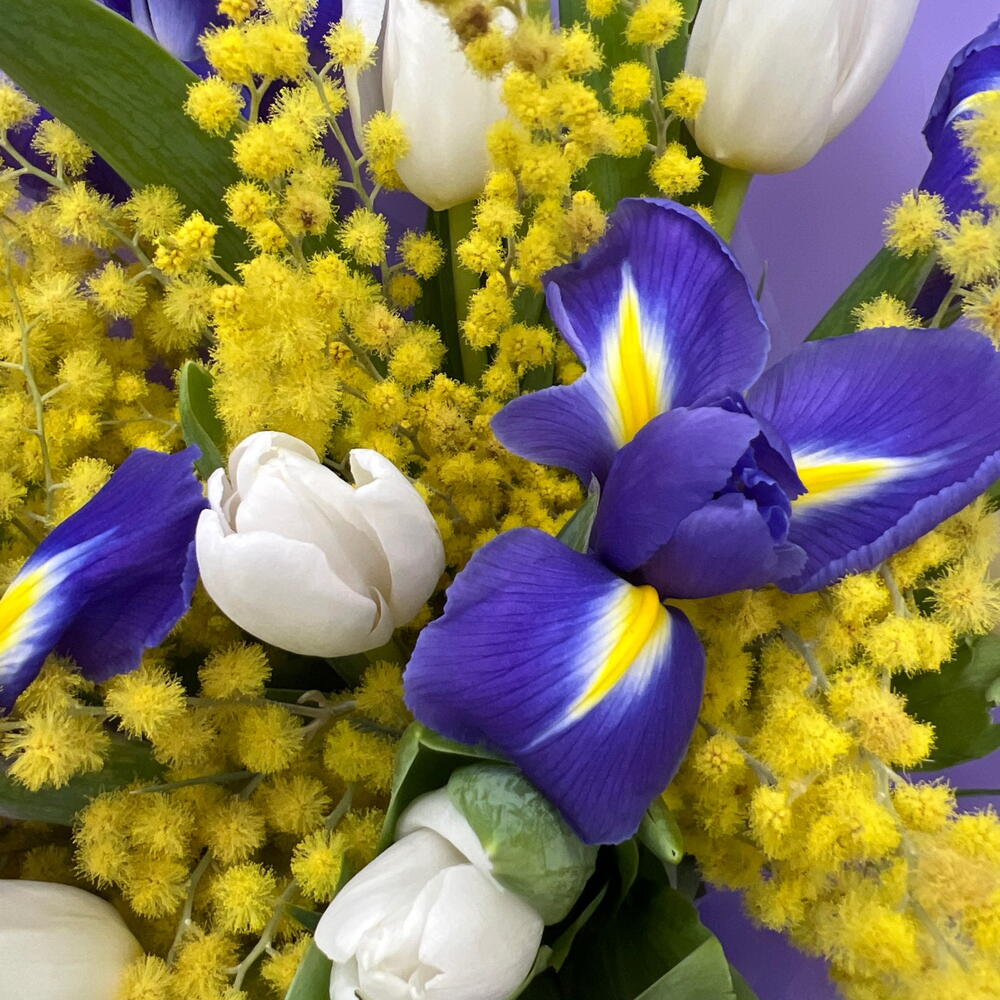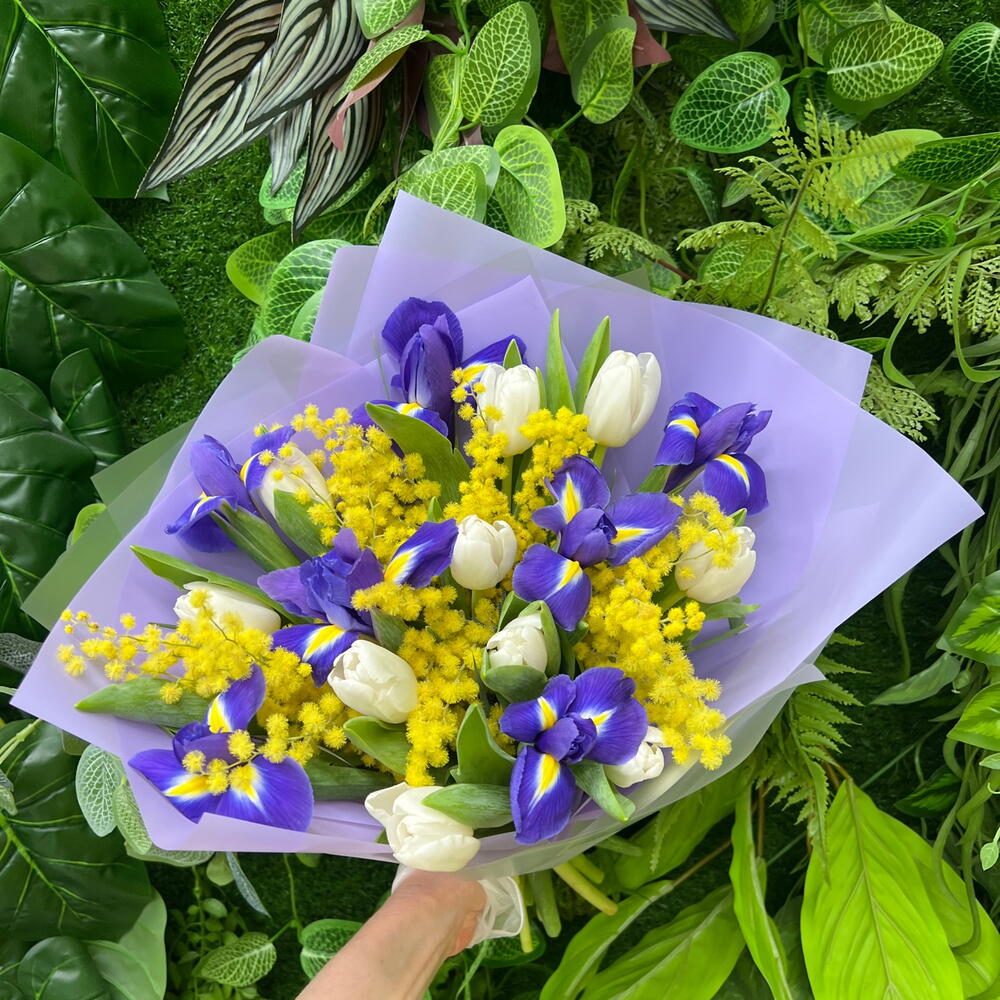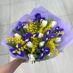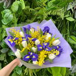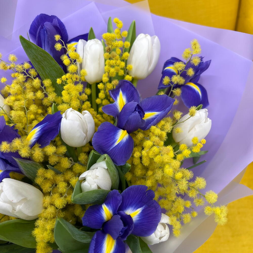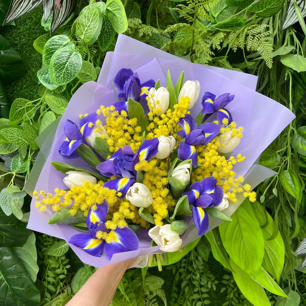 Ирис - 7 шт. Мимоза - 2 шт. Тюльпан - 10 шт. Авторская упаковка - 1 шт.