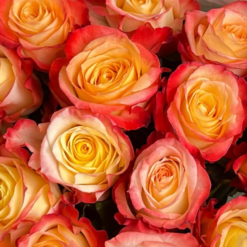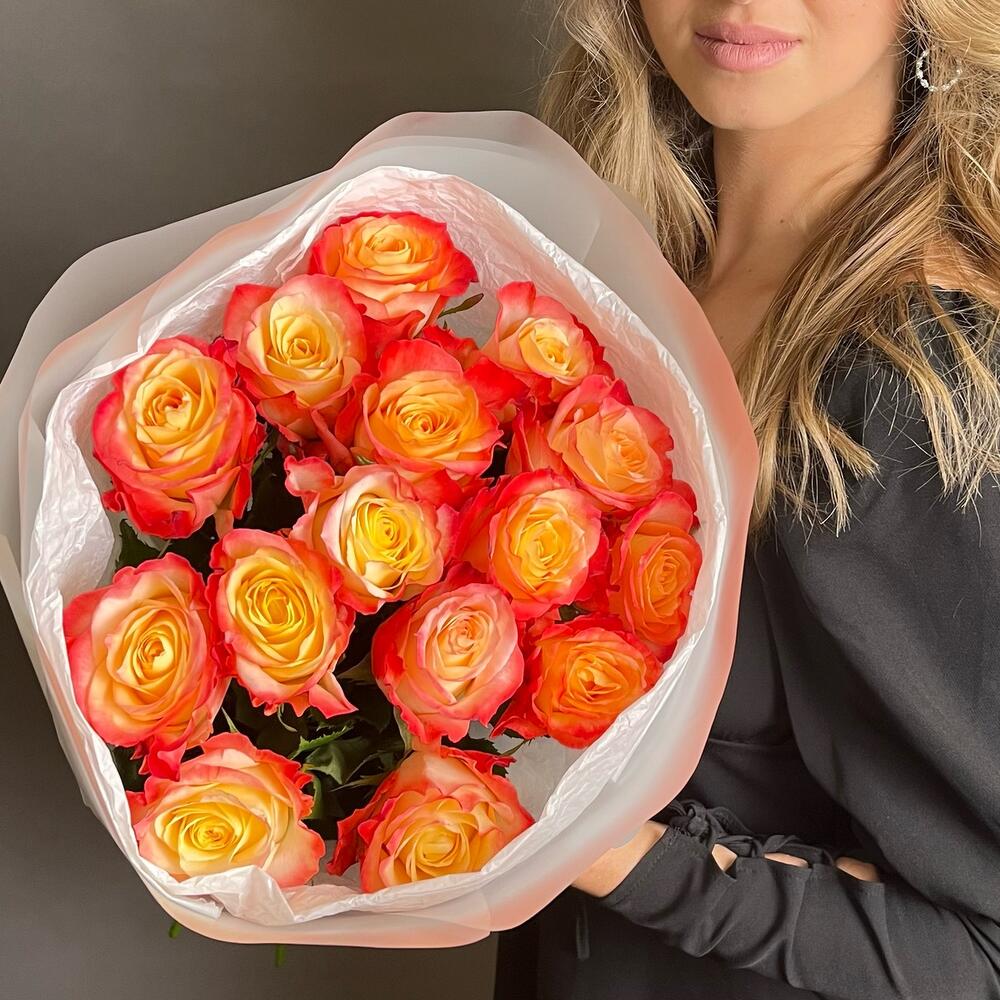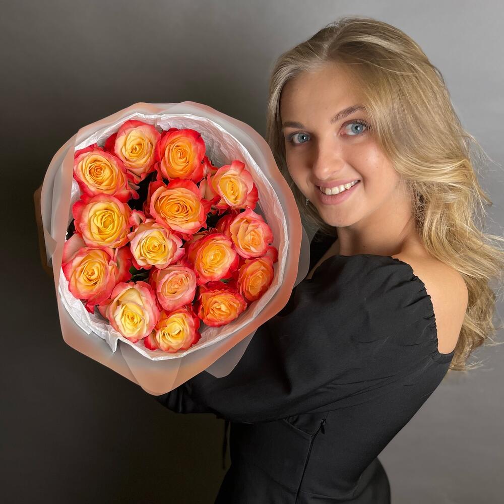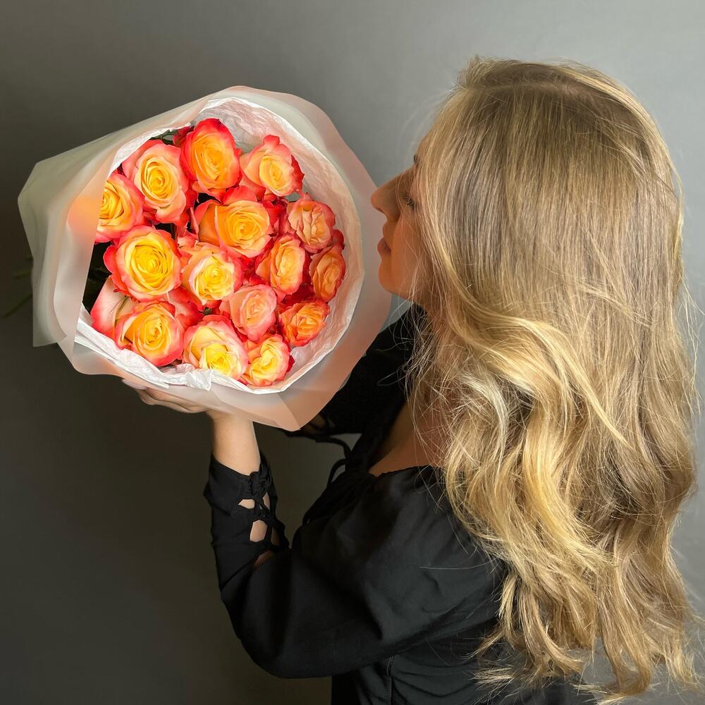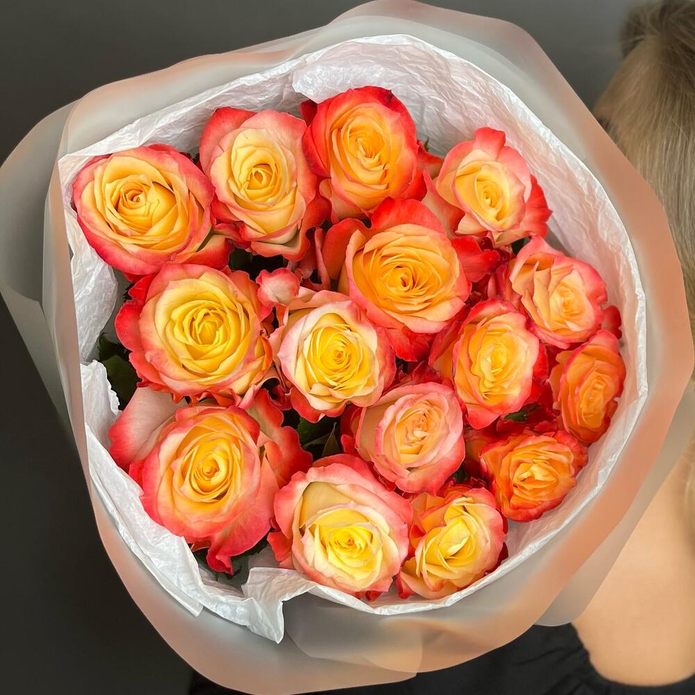 Красно оранжевые розы 15шт. Букет F029 Цветы Столицы