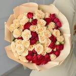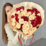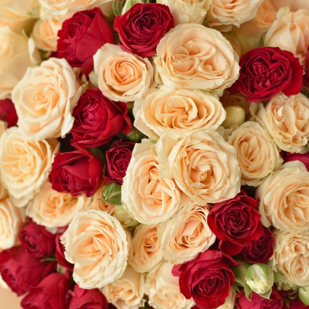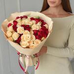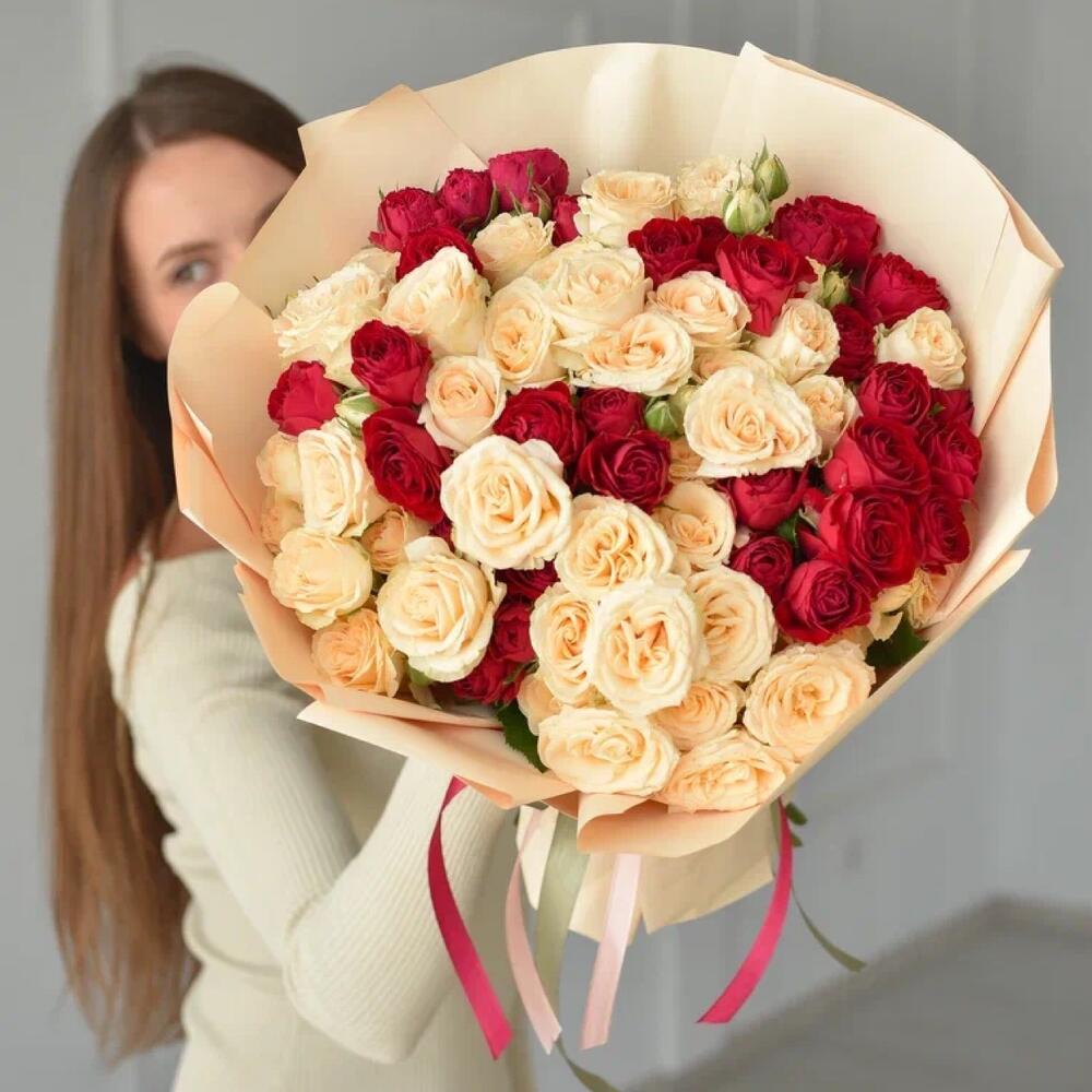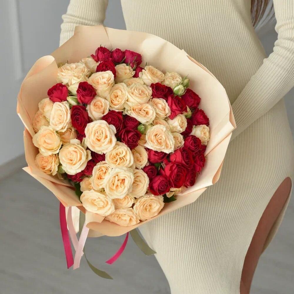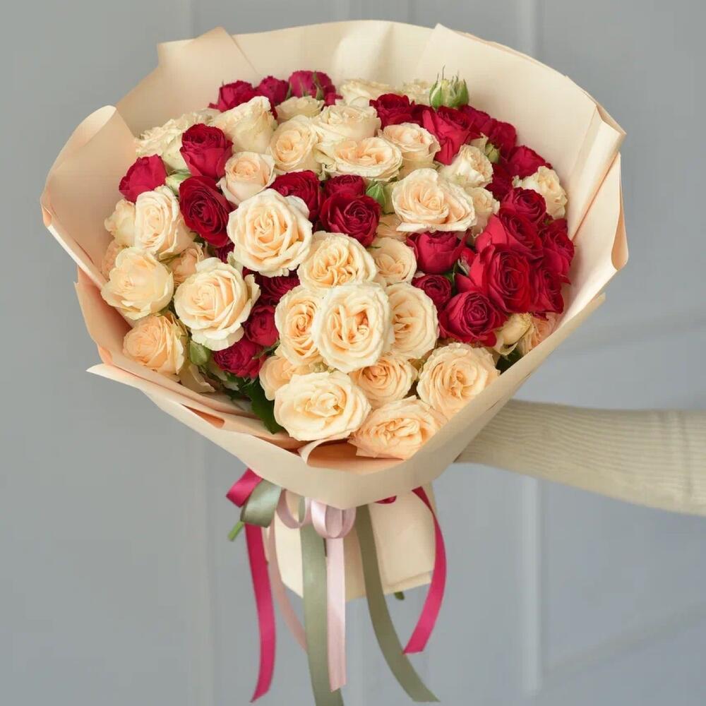 Атласная лента - 2 шт. Пленка матовая - 3 шт. ред баблс кустовая роза - 7 шт. салинеро кустовая роза - 8 шт.