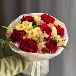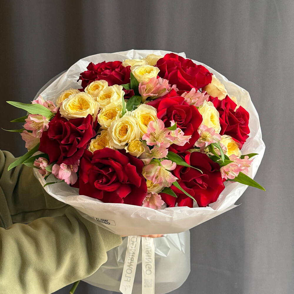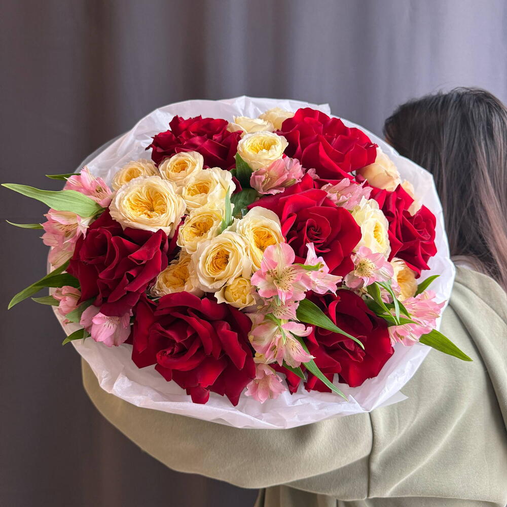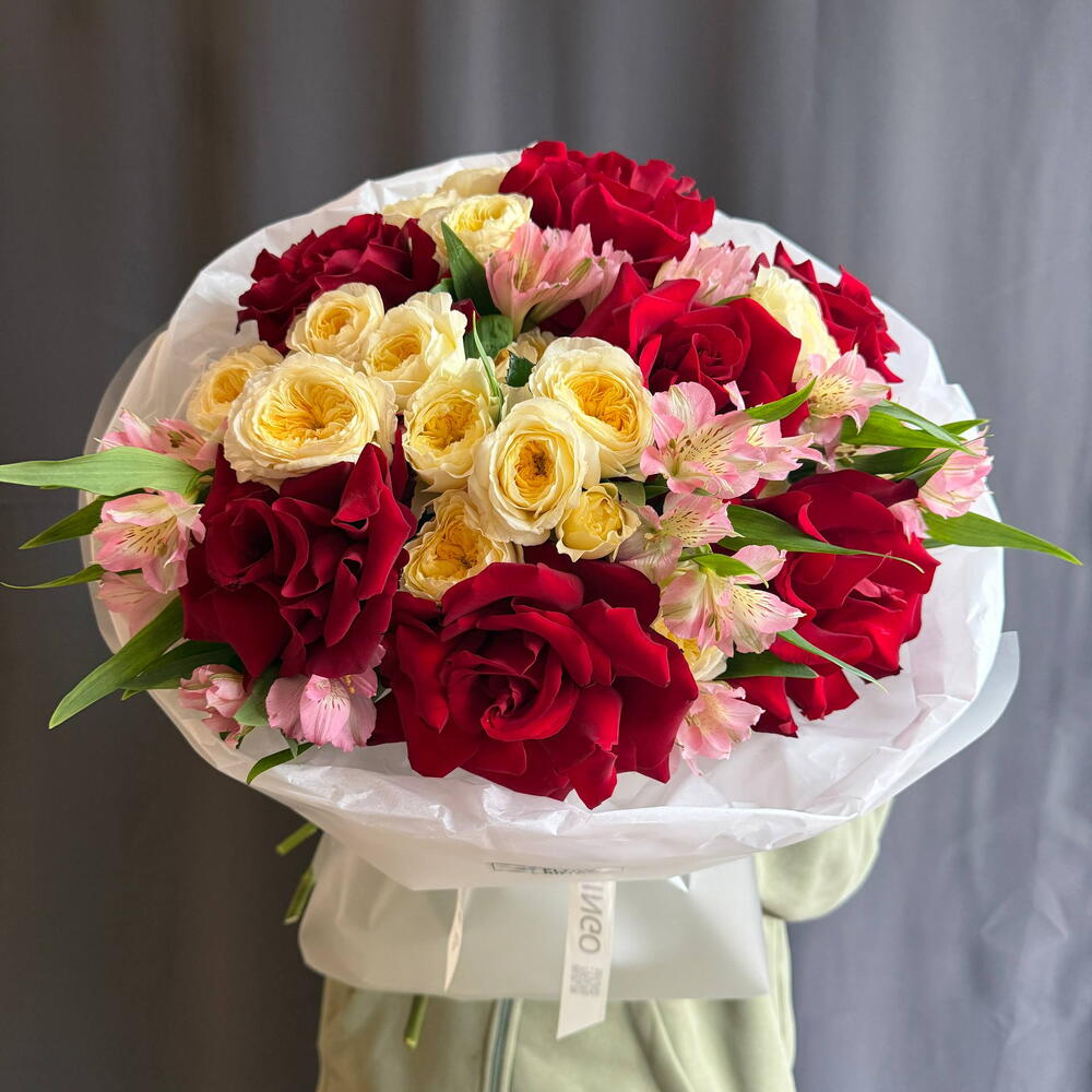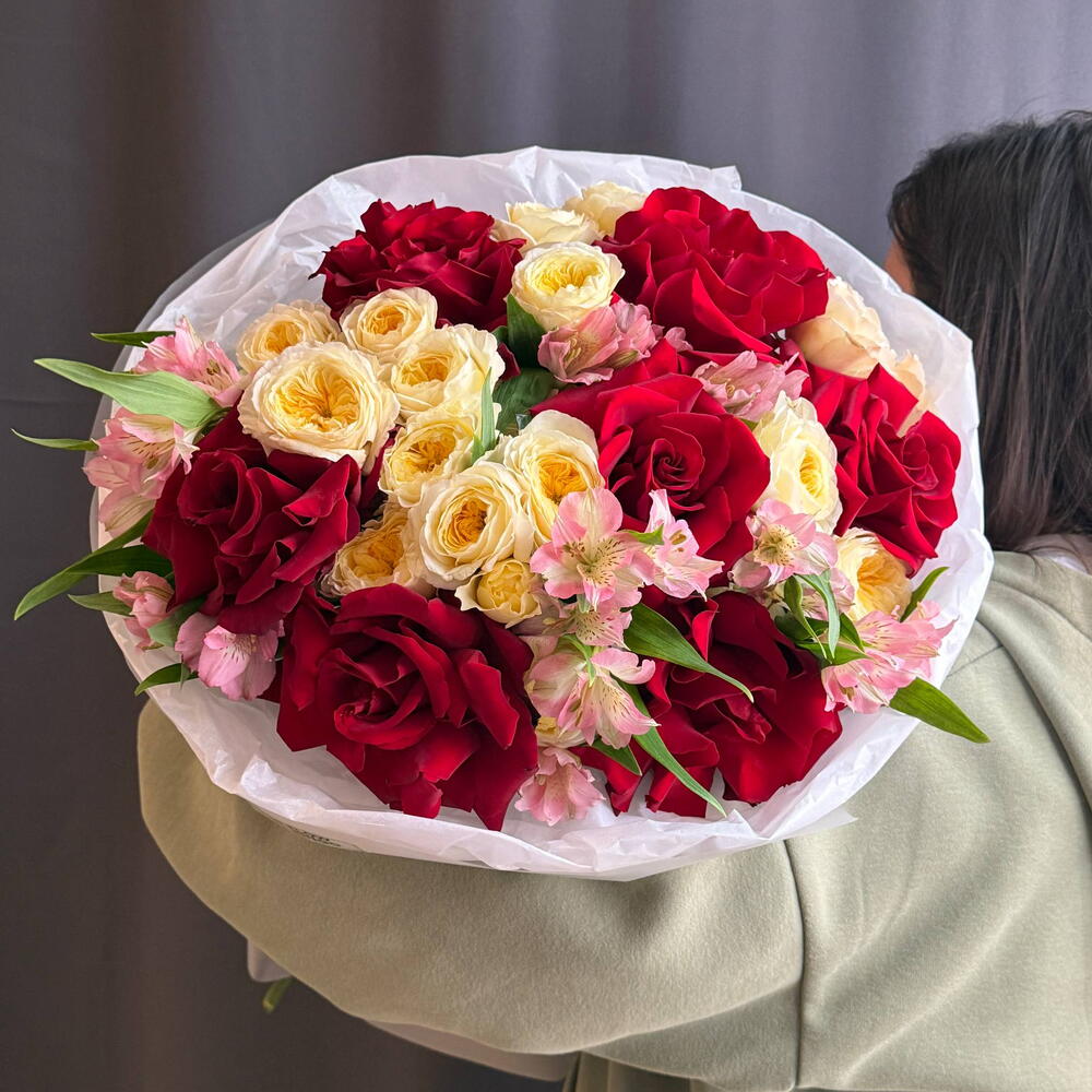 Яркий микс французских роз, кустовых роз и альстромерий 8210