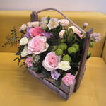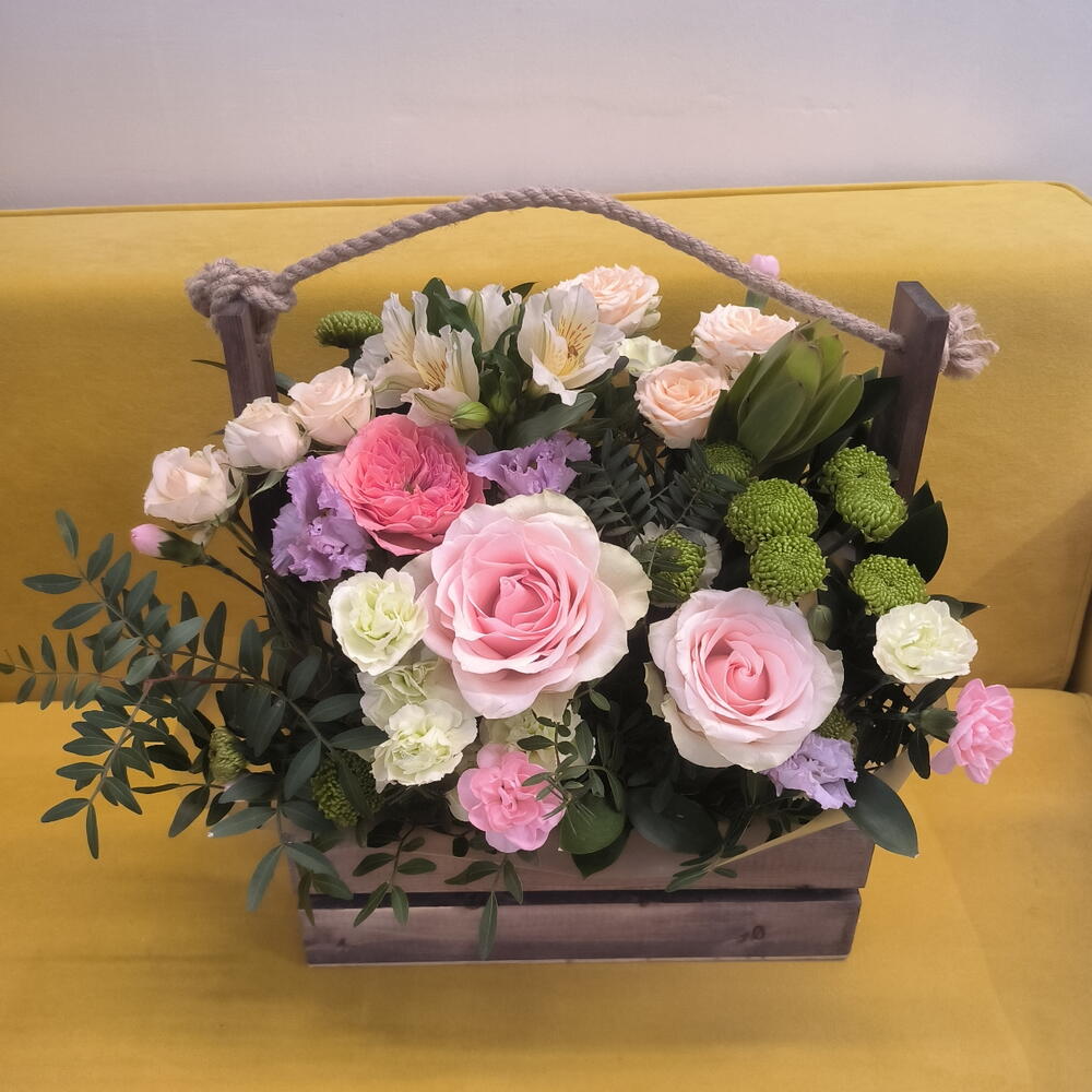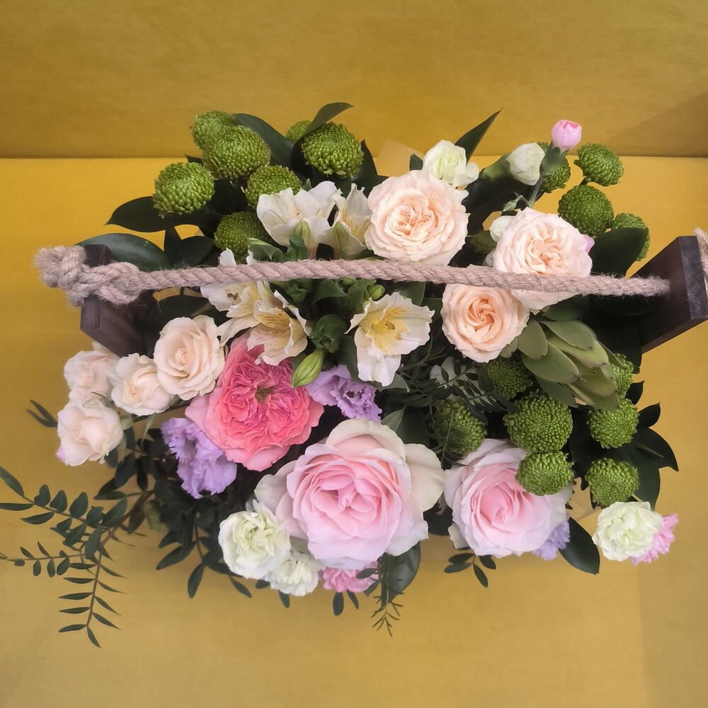 Многоцветное ассорти в деревянном ящике. Роза сорта Фрутетто, пионовидные розы Мандарин, кустовая жёлтая роза, микс кустовых диантусов, лиловый лизиантус собрались вместе чтобы радовать оттенками цвета. Зелень кустовой хризантемы, фисташки и рускуса дополняет композицию.