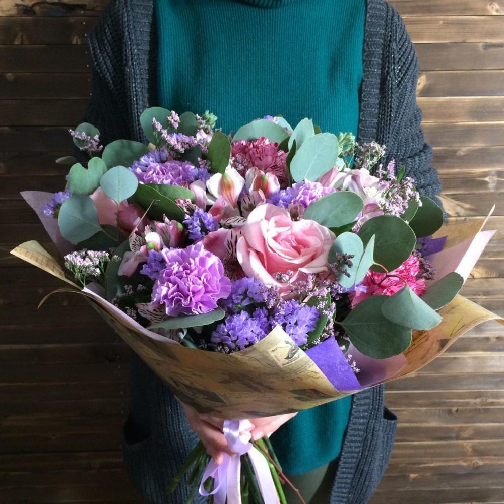 Альстромерия - 5 шт. Лимониум - 3 шт. Статица - 5 шт. Эвкалипт - 1 шт. Роза Эквадор - 5 шт. Гвоздика - 5 шт.
