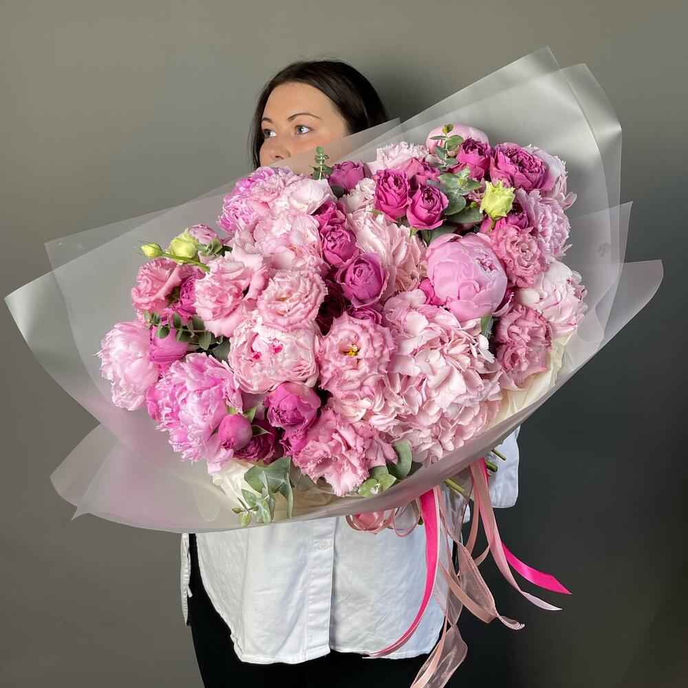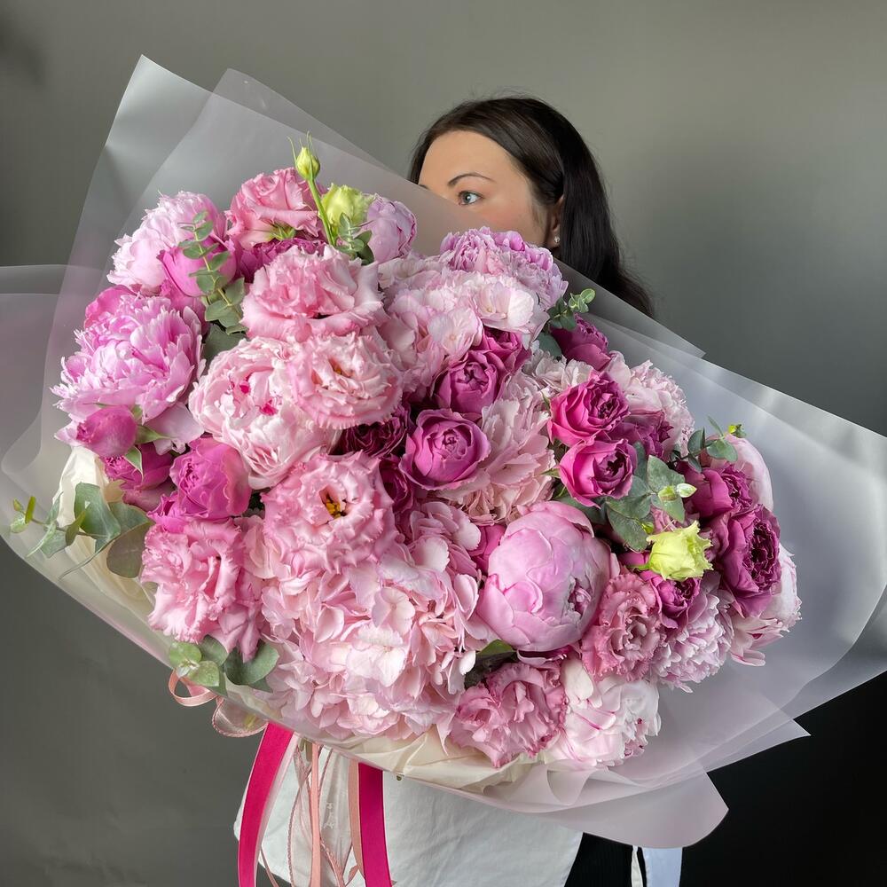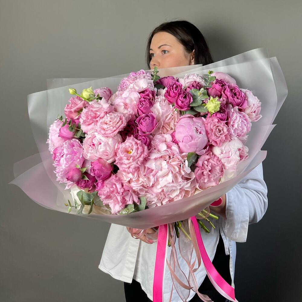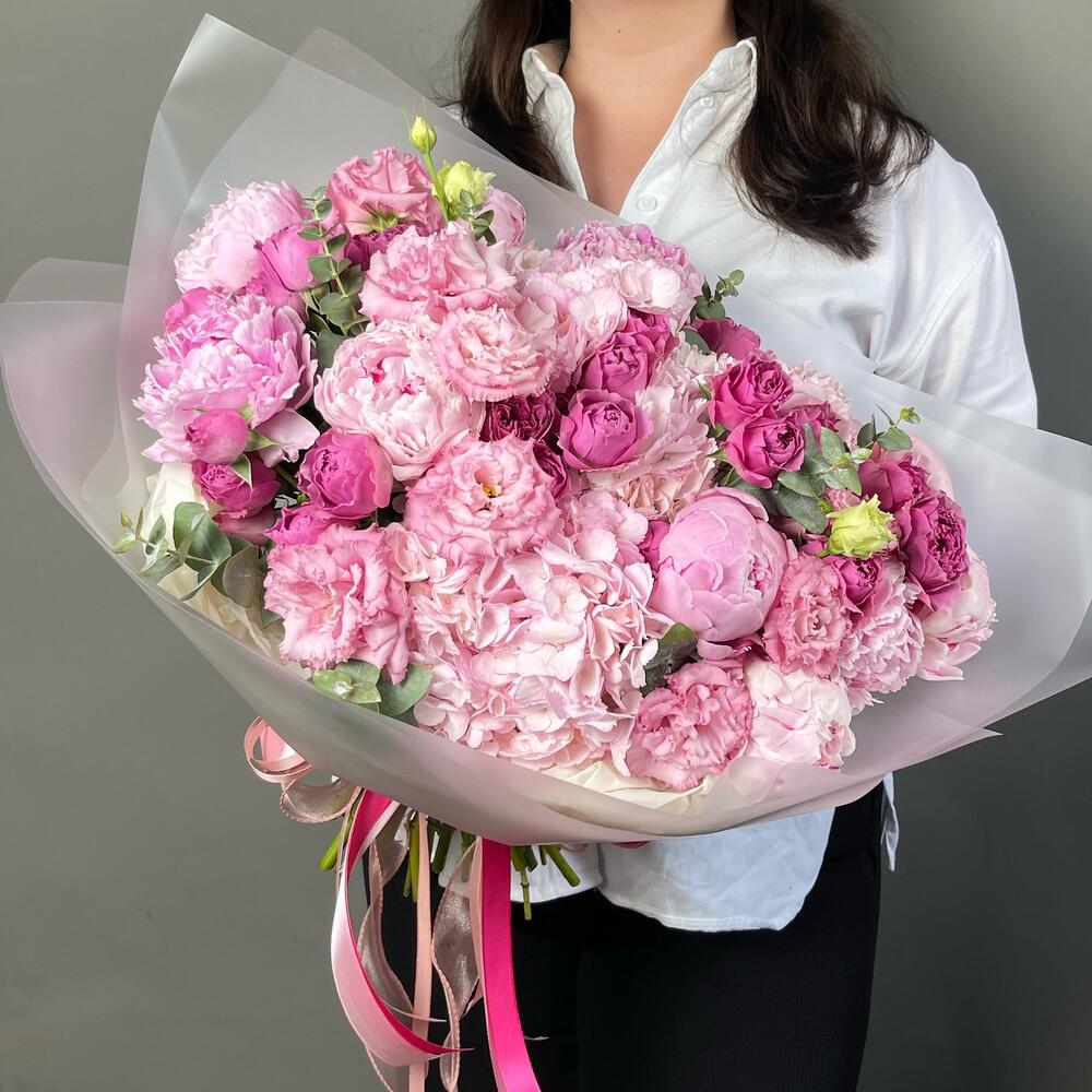 Лента атласная - 4 шт. Кустовая пионовидная роза - 5 шт. Упаковка дизайнерская - 2 шт. Гортензия розовая - 3 шт. Эвкалипт Baby Blue - 5 шт. Эустома алиса - 5 шт. пион или ранункулюс - 7 шт.