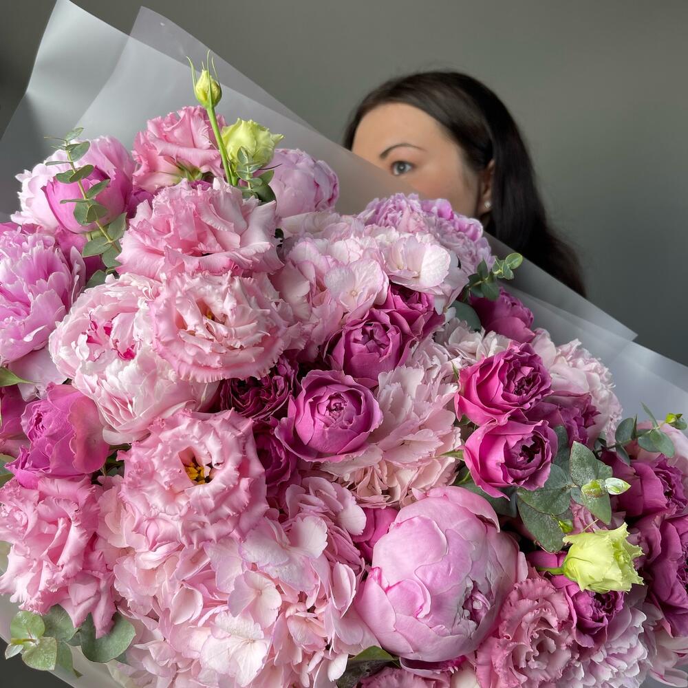 Ароматный букет из пионовидных кустовых роз, воздушной гортензии, эвкалипта и кружевной эустомы. В зависимости от сезона флористы могут использовать в букете пионы или ранункулюсы🌿 На объем и цветовое сочетание букета это не повлияет💕