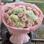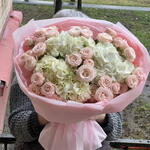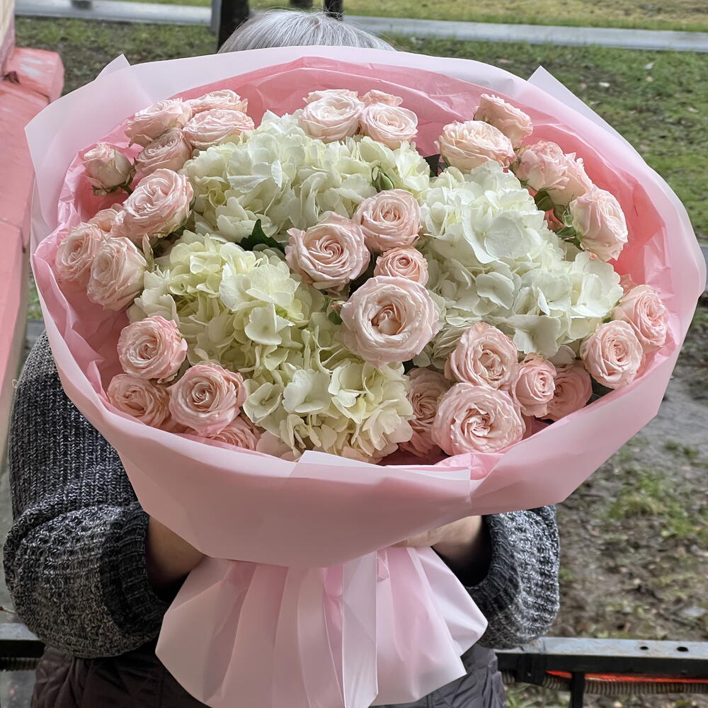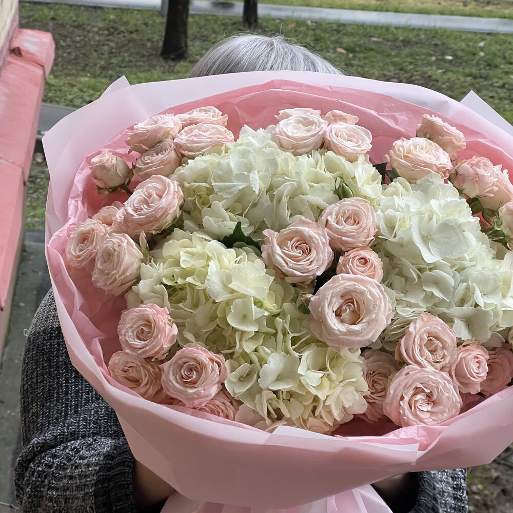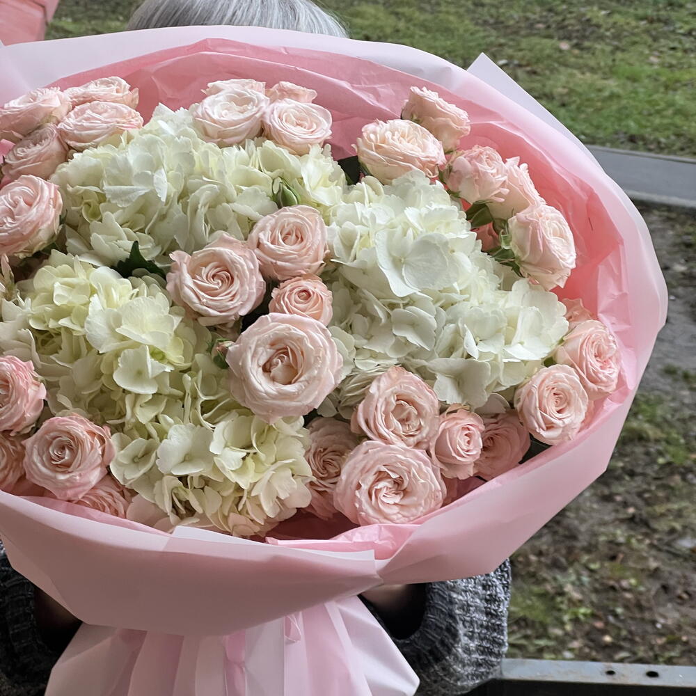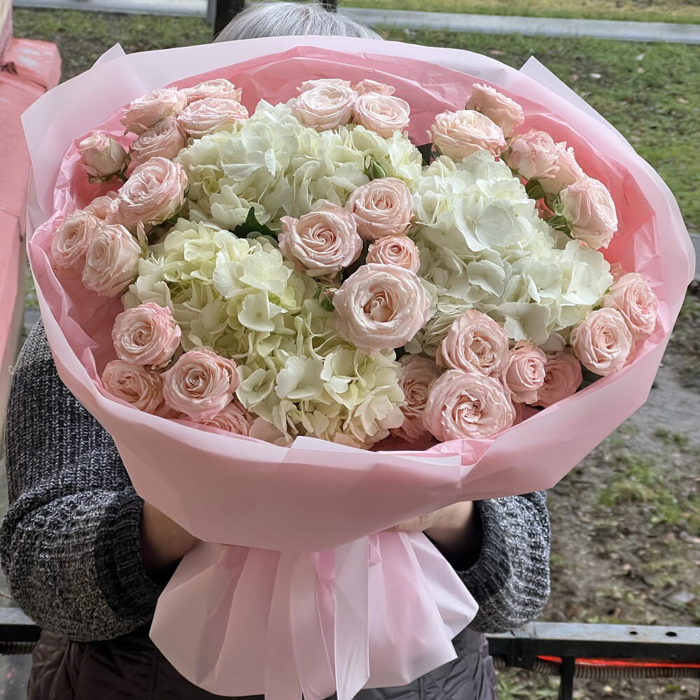 Лента атласная - 2 шт. Упаковка дизайнерская - 2 шт. Роза кустовая пионовидная Бомбастик - 9 шт. Гортензия Премиум Микс - 3 шт.