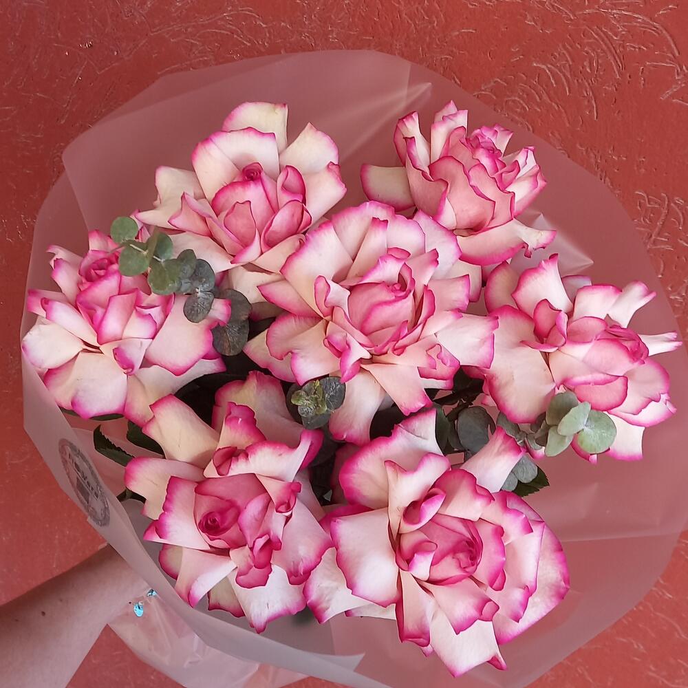 Emballage - 1 pce Krizal(alimentation) - 1 pce Carte postale avec vos souhaits - 1 pce roses françaises - 7 pce зелень рускус или эвкалипт - 3 pce