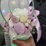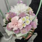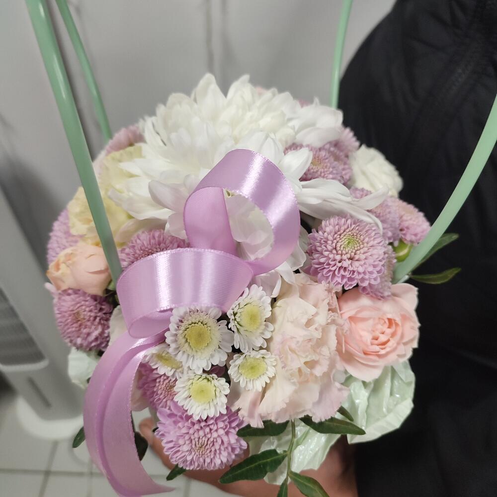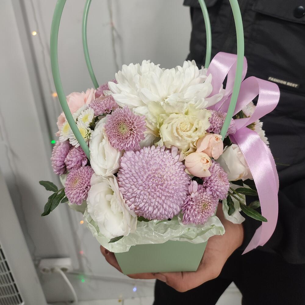Ruban - 1 pce Pistas - 1 pce Oeillet rose - 1 pce Eustoma - 1 pce Silence - 1 pce Santini - 4 pce Chrysanthème à tête unique - 2 pce Sac à main - 1 pce Oasis florale - 1 pce