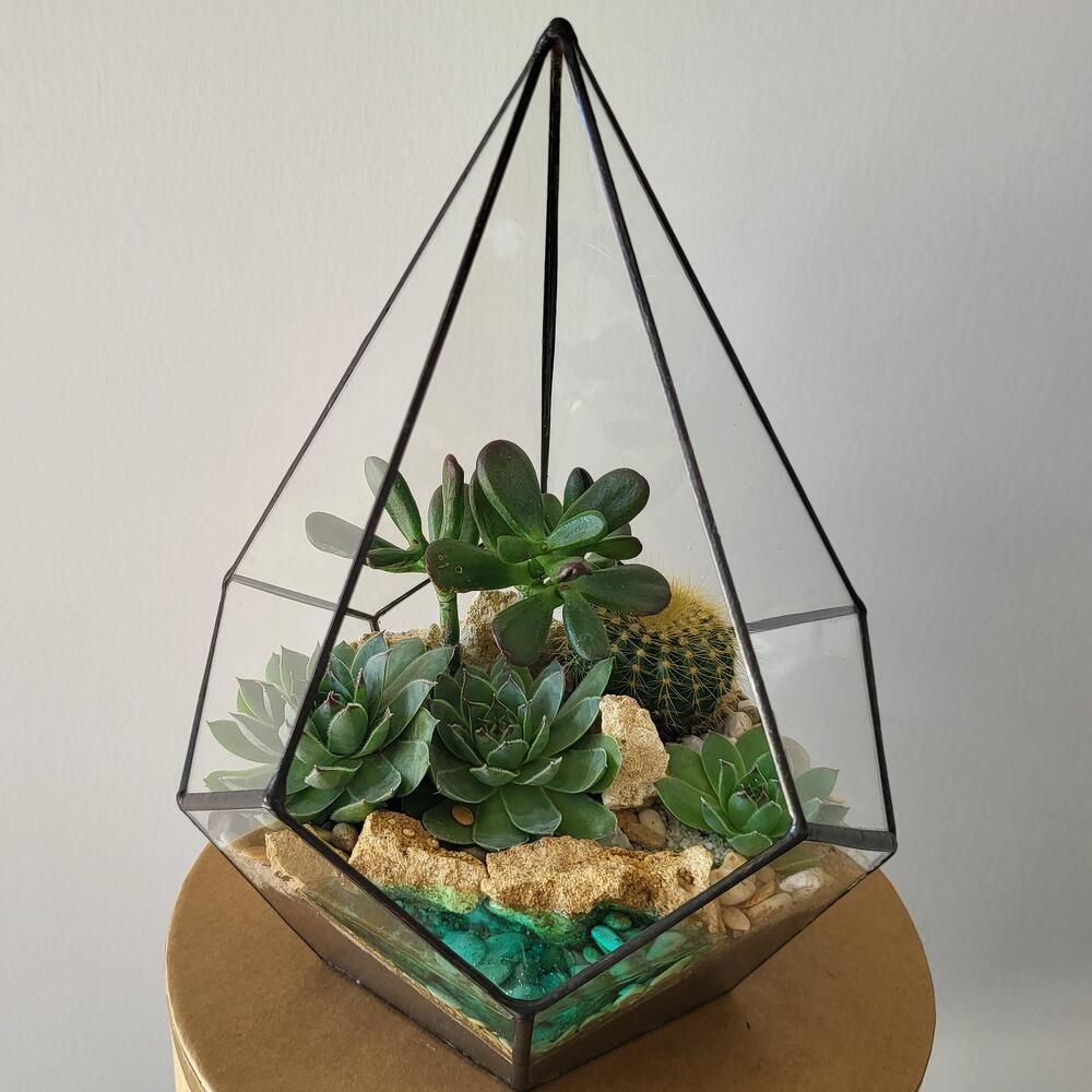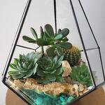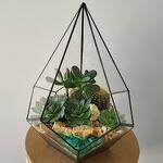 Этот мини-флорариум — сочетание природной эстетики и минимализма. Компактный, но выразительный, он создаёт атмосферу уюта и свежести, привнося в интерьер нотки природной гармонии. Его сбалансированная композиция с разными фактурами и оттенками делает его стильным акцентом, который не требует сложного ухода. Идеальный выбор для тех, кто хочет добавить немного живой природы в своё пространство.