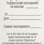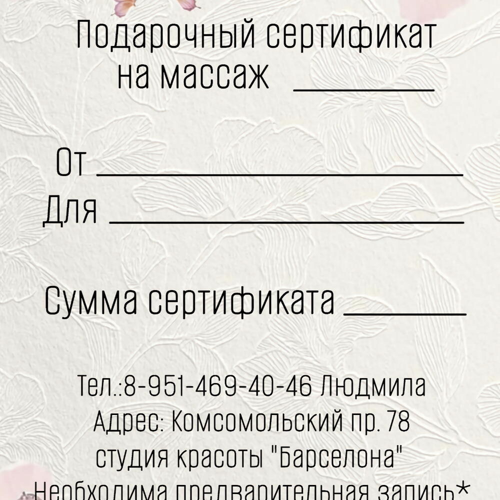 Проведите время с удовольствием и пользой! Вы можете выбрать массаж любой зоны ( спина, ноги, шейно- -воротниковая зона, голова) который вам необходим, в рамках этого времени. Комплексная процедура включает в себя массаж спины 30 минут + массаж лица + ультразвуковая чистка лица/альгинатная маска (на выбор) ♥️После процедуры вы получите в подарок массажный мяч для ног ♥️ Действует в Челябинске. Место проведения смотрим ⬇️ВНИЗУ⬇️ ❗️СРОК ДЕЙСТВИЯ: 1 ГОД❗️ ✅Гарантийный срок сохранения цены: 6 месяцев. ♦️ДОСТАВКА на (e-mail):♦️ Место: любая точка мира ✅ЭЛЕКТРОННО на e-mail покупателя (получателя) ✅Цена доставки: бесплатно 0 рублей ✅Формат доставки: файл PDF ✅Вид поставки: электронный подарочный сертификат ✅В поле «комментарий» или в чате, напишите ВАШИ (получателя ): имя и e-mail ✅В рабочее время сотрудники отправят сертификат на e-mail ♦️ПРОГРАММА:♦️ 💥Встреча в студии 💥Знакомство с мастером 💥Подготовка к массажу ♦️ВАЖНО♦️ ⚡️Подарок рассчитан на одного человека ⚡️Общая продолжительность 90 минут ⚡️Все необходимые принадлежности предоставляются в салоне ⚡️Имеются противопоказания перед процедурой необходимо проконсультироваться со специалистом ⚡️Сезон круглый год ♦️ГДЕ ПРОХОДИТ:♦️ Город Челябинск Комсомольский проспект 78 студия красоты ♥️Барселона♥️