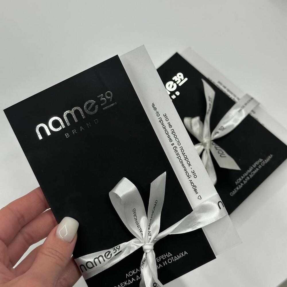 NAME 39 - это калининградский бренд женской одежды, с собственным производством. Наш оффлан магазин находится по адресу ТЦ Z-форт. Подарочный сертификат - будет идеальным способом порадовать любимую, подругу, маму, коллегу. Каждая будет рада качественной одежде от локального бренда. Передайте любовь и заботу, предоставив самостоятельный выбор в магазине NAME 39.