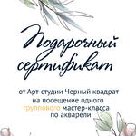 Обязательно укажите в чате электронную почту, на которую необходимо выслать сертификат! Подарочный сертификат на мастер-класс по акварельной живописи можно приобрести в электронном виде - пришлем на ваше электронную почту в течение 60 минут в рабочее время. Срок действия сертификата 1 год с момента покупки. В стоимость входят все необходимые материалы, акварельная бумага из 100% хлопка размером А3, вода, чай/кофе в студии. Каждый участник рисует индивидуальный сюжет, можно выбрать как из нашего каталога, так и принести с собой идею из головы или из интернета. В студии есть цветной принтер и для удобства мы можем распечатать ваш референс. Занятия проводятся в группах до 8 человек. Продолжительность занятия до 3х часов.