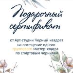 Обязательно укажите в чате электронную почту, на которую необходимо выслать сертификат! Подарочный сертификат на групповой мастер-класс Спиртовые чернила (16+) - это отличная возможность расширить границы творчества! По данному сертификату можно записаться одному человеку на групповой мастер-класс по расписанию и создать работу на арт-борде (круг или квадрат) 30 см. Срок действия сертификата 1 год с момента покупки. В стоимость входят все необходимые материалы, вода, чай/кофе в студии. Продолжительность занятия до 3х часов.