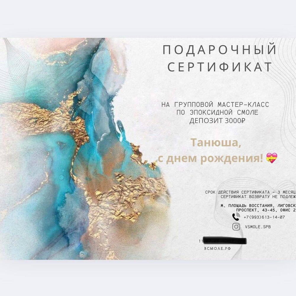 Подарите 2 часа медитативного творчества с эпоксидной смолой. Все материалы включены, унесёт готовое изделие. Два часа красоты, блёсток и волшебства смолы. Сертификат дарит участие в мастер-классе по эпоксидной смоле на создание сервировочной доски для одного человека. Под руководством мастера гость создаст авторское изделие, подберёт палитру, добавит крошку, перламутр и золото. Подходит даже новичкам — главное желание творить. Локация — уютная студия у м. Площадь Восстания. Мы бережно упакуем готовую работу — её приятно забрать и подарить. Что включено: • 1 место на мастер-классе по эпоксидной смоле (~2 часа) • Материалы и инструменты, декор • Помощь мастера на каждом шаге • Упаковка готового изделия Условия: • Срок действия: 3 или 6 месяцев со дня покупки • Предварительная запись обязательна • Сертификат покрывает любой базовый формат • Можно обменять на другой формат до записи • Электронный сертификат приходит в мессенджере, можно выбрать подпись для получателя, также можно будет забрать бумажный сертификат только самовывозом Как активировать получателю: 1. Выберите дату и формат, написав нам в чат 2. Назовите номер сертификата. 3. Приходите за 5–10 минут до начала — всё остальное подготовим мы. FAQ: — Нужен ли опыт? Нет, формат для новичков. — Что если захочу другое изделие? Можно доплатить по прайсу студии. — Когда заберу работу? Большинство изделий - через 1–3 дня (мы сообщим). — Можно прийти с мамой? Да, возьмите второй сертификат или оформите доплату. — Можно продлить срок? Да, напишите нам заранее.