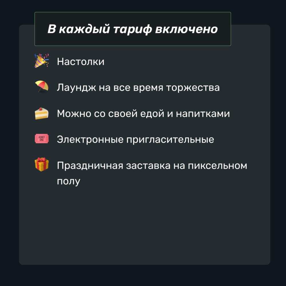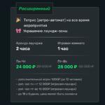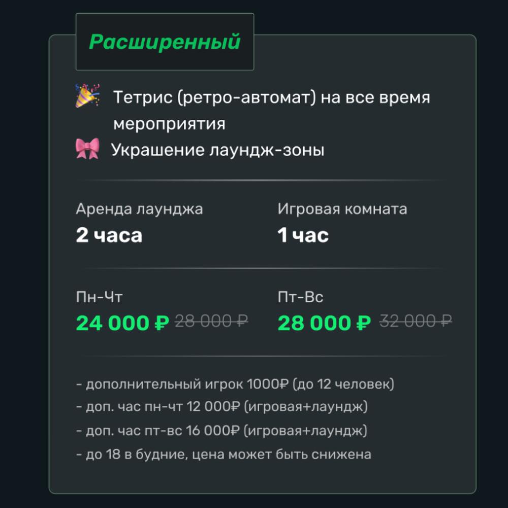 Данный сертификат электронный, с отправкой на ваши контакты. Пожалуйста, уточните ваш email в комментарии к заказу. Расширенный пакет До 10 человек С украшением лаундж-зоны В стоимость сертификата входит: Аренда лаунджа-2 часа Игровая комната-1 час Сертификат действует с пятницы по воскресенье дополнительный игрок 1000₽ (до 12 человек) доп. час пн-чт 12000 ₽ (игровая+лаундж) доп. час пт-вс 16000 ₽ (игровая+лаундж) В каждый тариф включено: Приставка, большой экран, настолки Лаундж на все время мероприятия Можно со своей едой и напитками Электронные пригласительные Праздничная заставка на пиксельном полу Адрес: Москва, Большая Серпуховская, 31к1