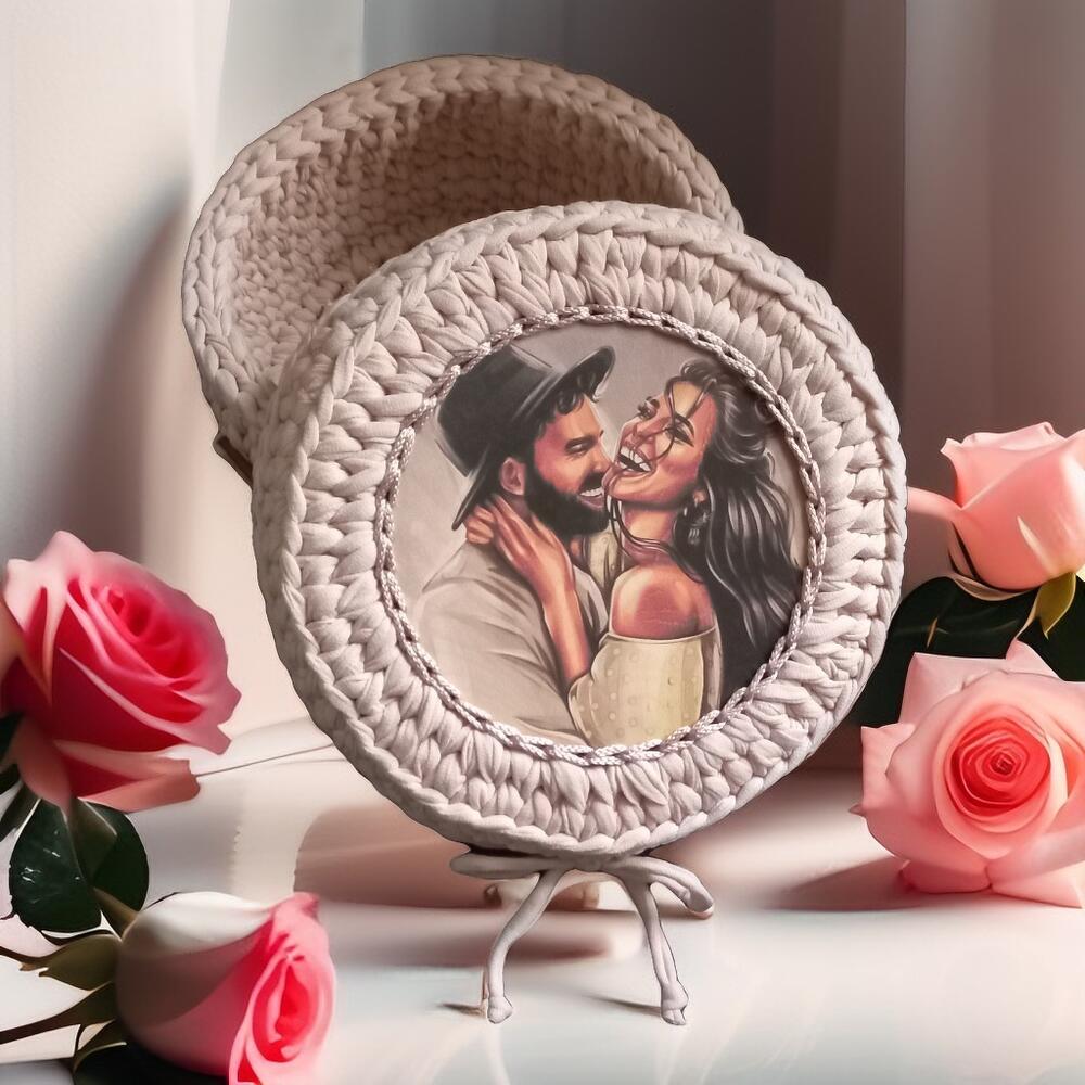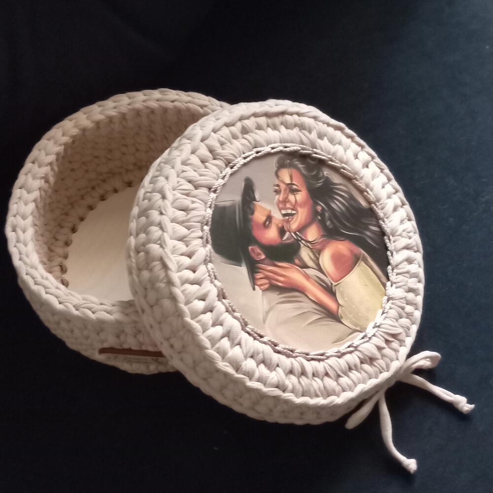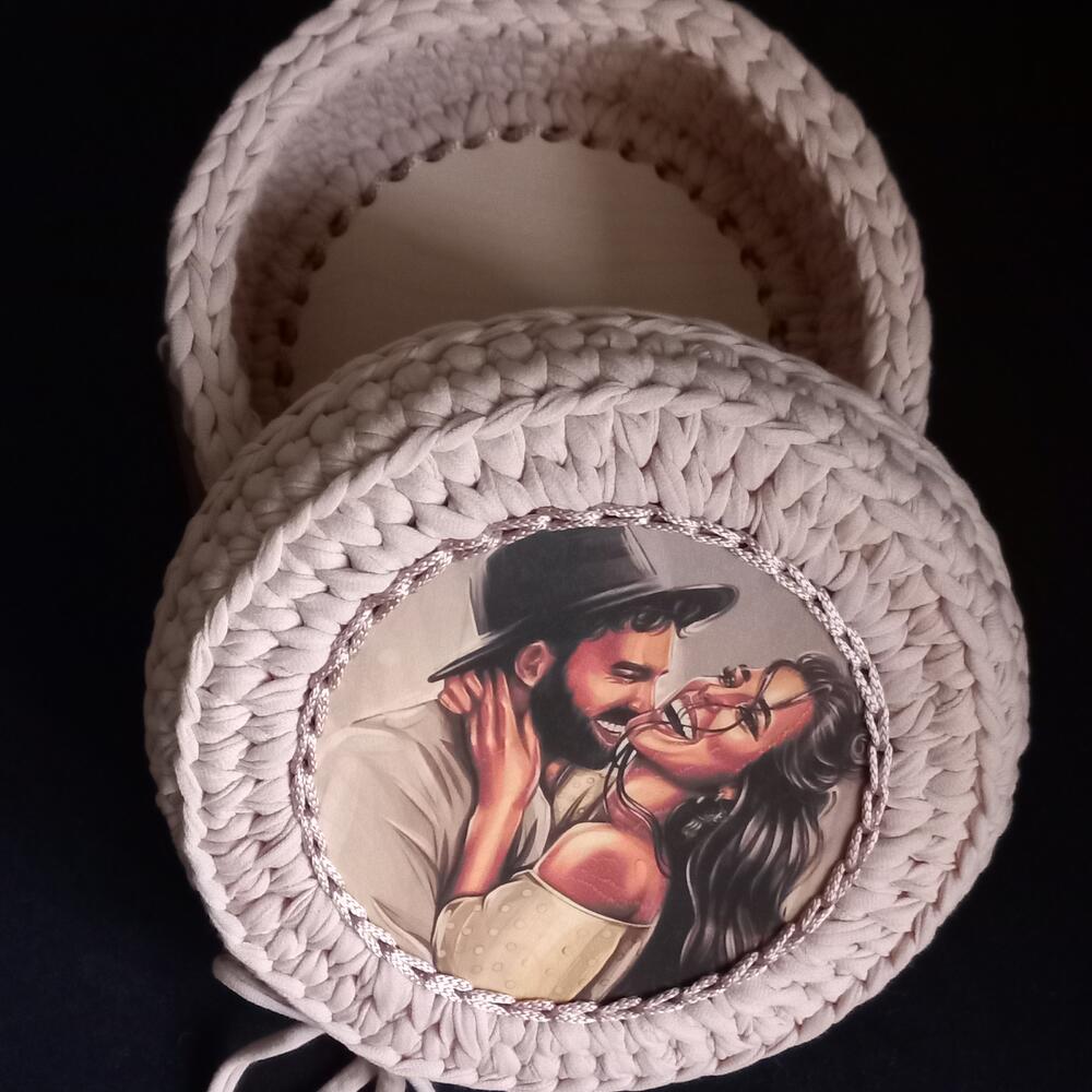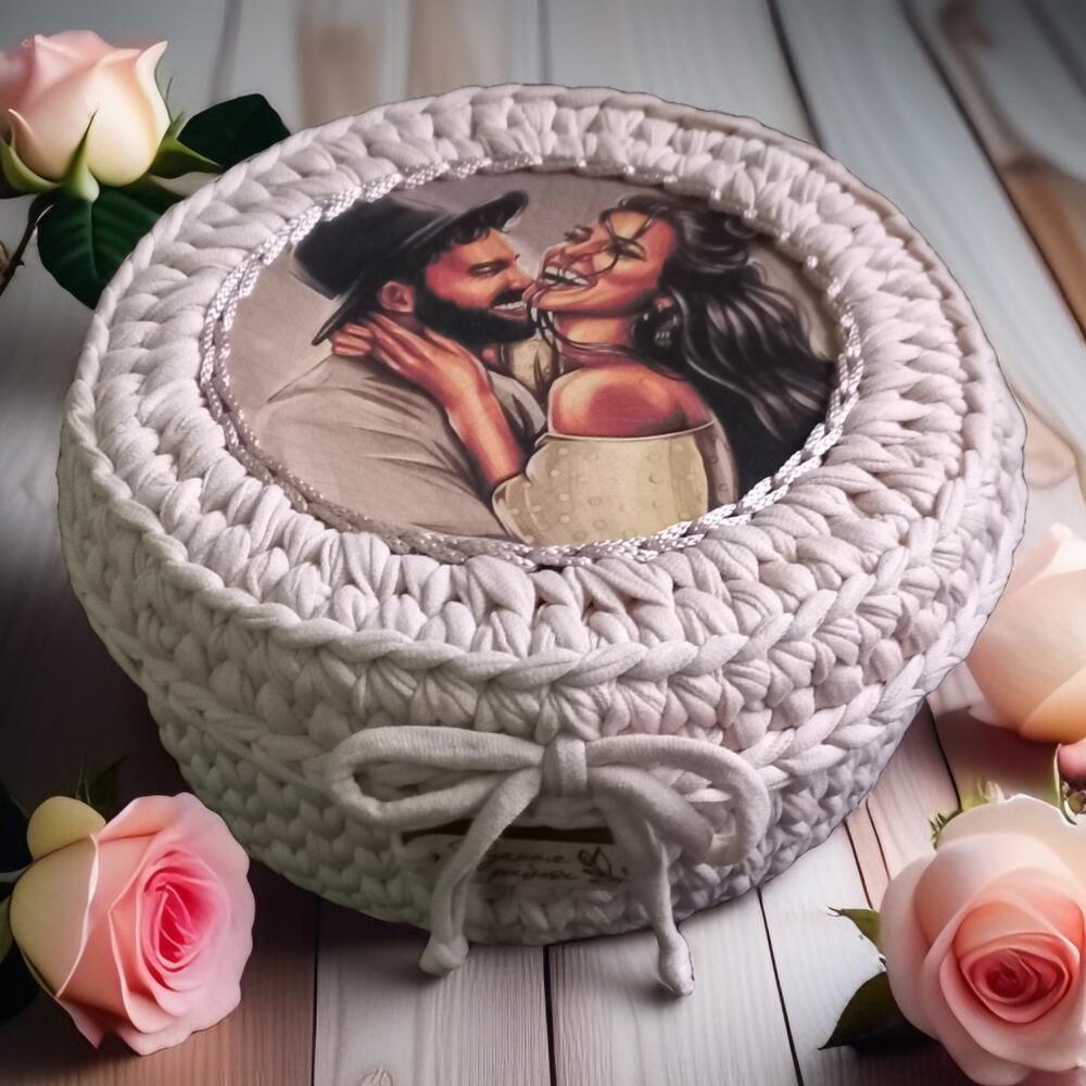 Корзина интерьерная из трикотажной пряжи с деревянным донышком.