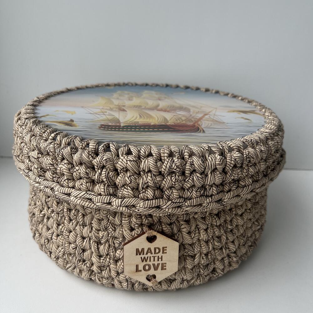 Интерьерная корзина ручной работы выполнена из хлопковых нитей. Принт с двух сторон. Акрил. Корзина-шкатулка отлично подойдёт для хранения аксессуаров и любых других мелочей. Размер корзины 20*20см. Высота 11см. Корзина может быть как самостоятельным подарком, либо может быть отличным дополнением