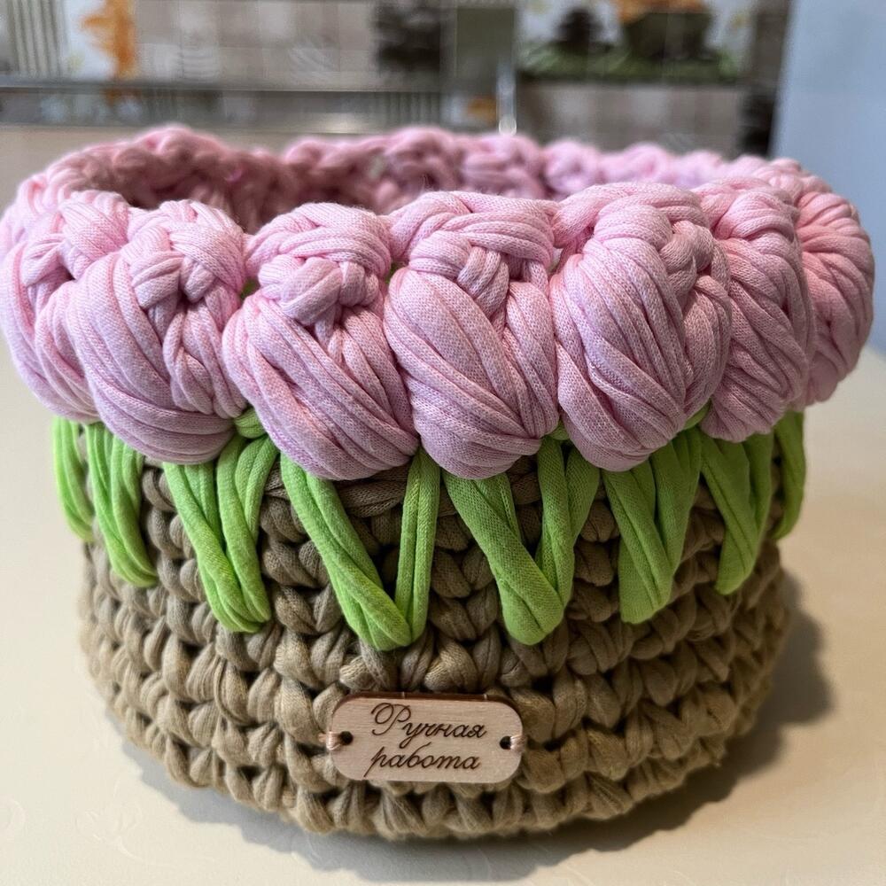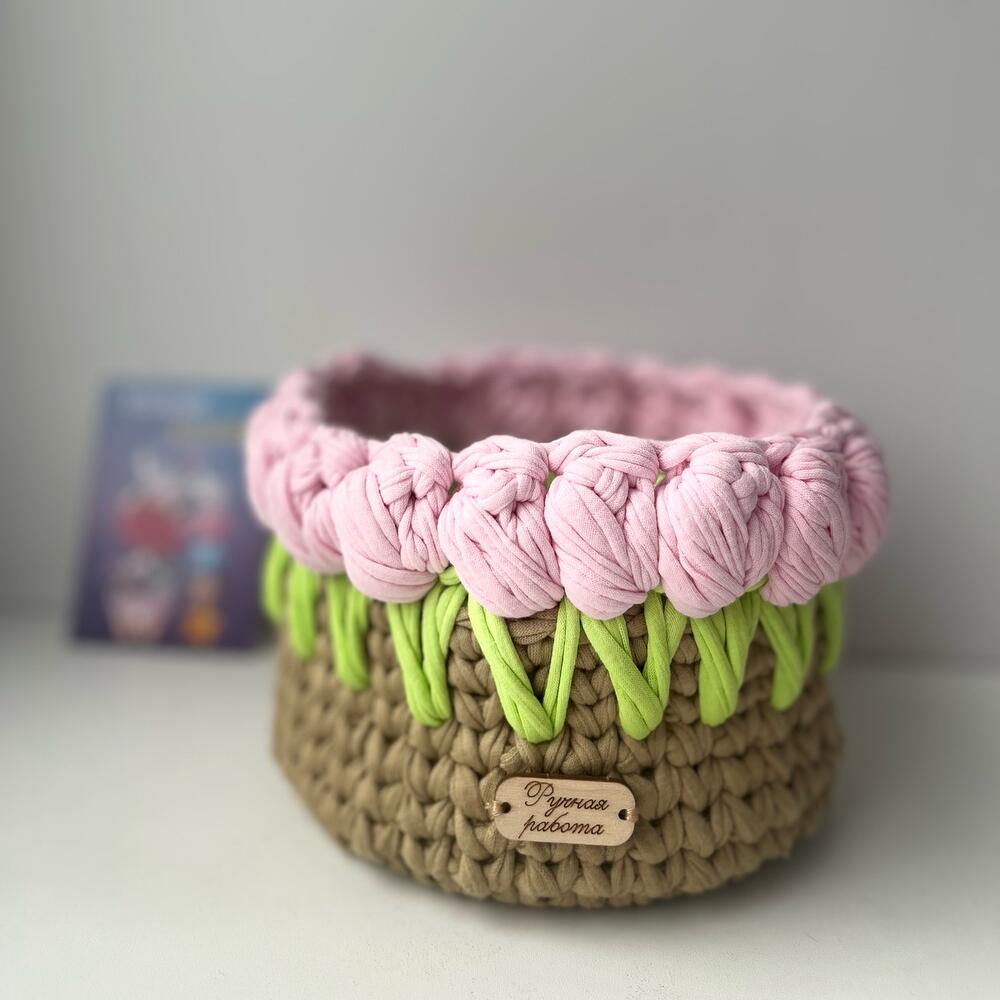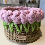 Корзина их хлопковых нитей с декоративными элементами в виде тюльпанов. Корзина открытая , размер15*15см.