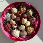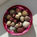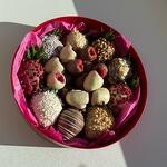 Круглый бокс с клубникой в шоколаде и свежей малиной в шоколаде. Белый и молочный бельгийский шоколад Callebaut. Цвет коробки можно изменить