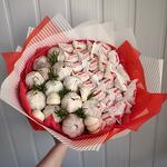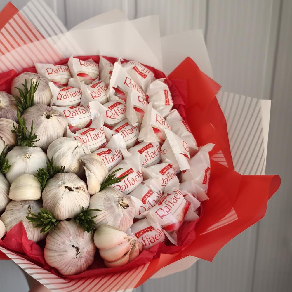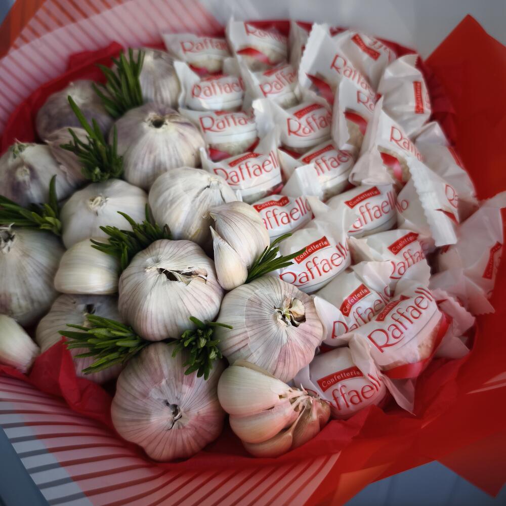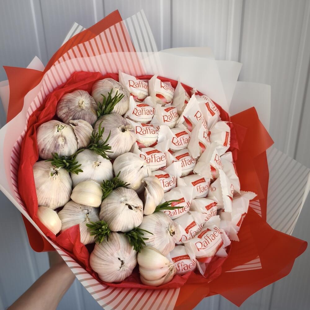 Необычный букет для креативного поздравления на любой праздник. В нем сочетаются конфеты и чеснок,что точно запомниться получателю на долго. Подарок о котором будут говорить очень долго