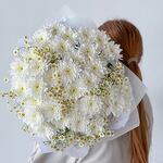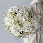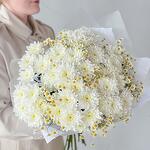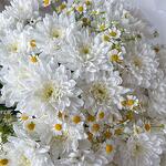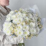 Krizantém bokor - 7 db. Ромашка кустовая - 6 db. Тишью белое - 2 db. Калька упаковка - 3 db.