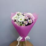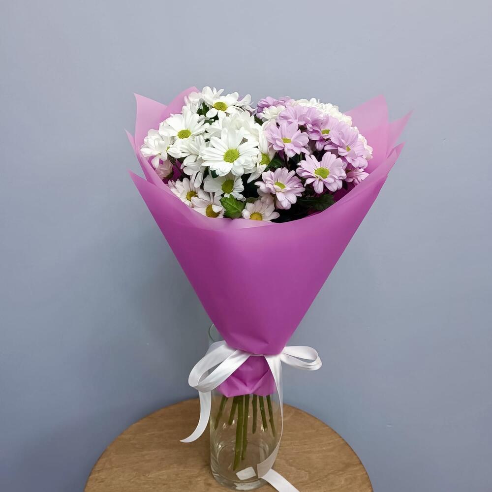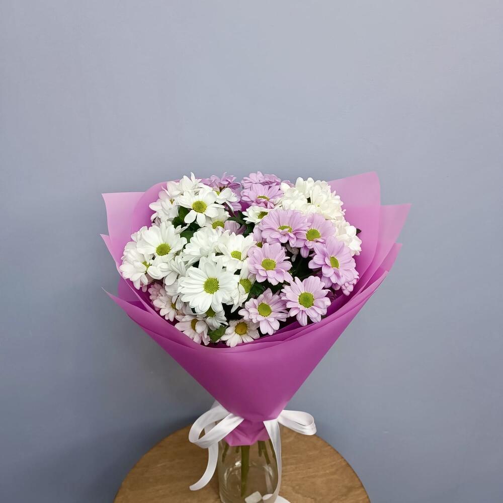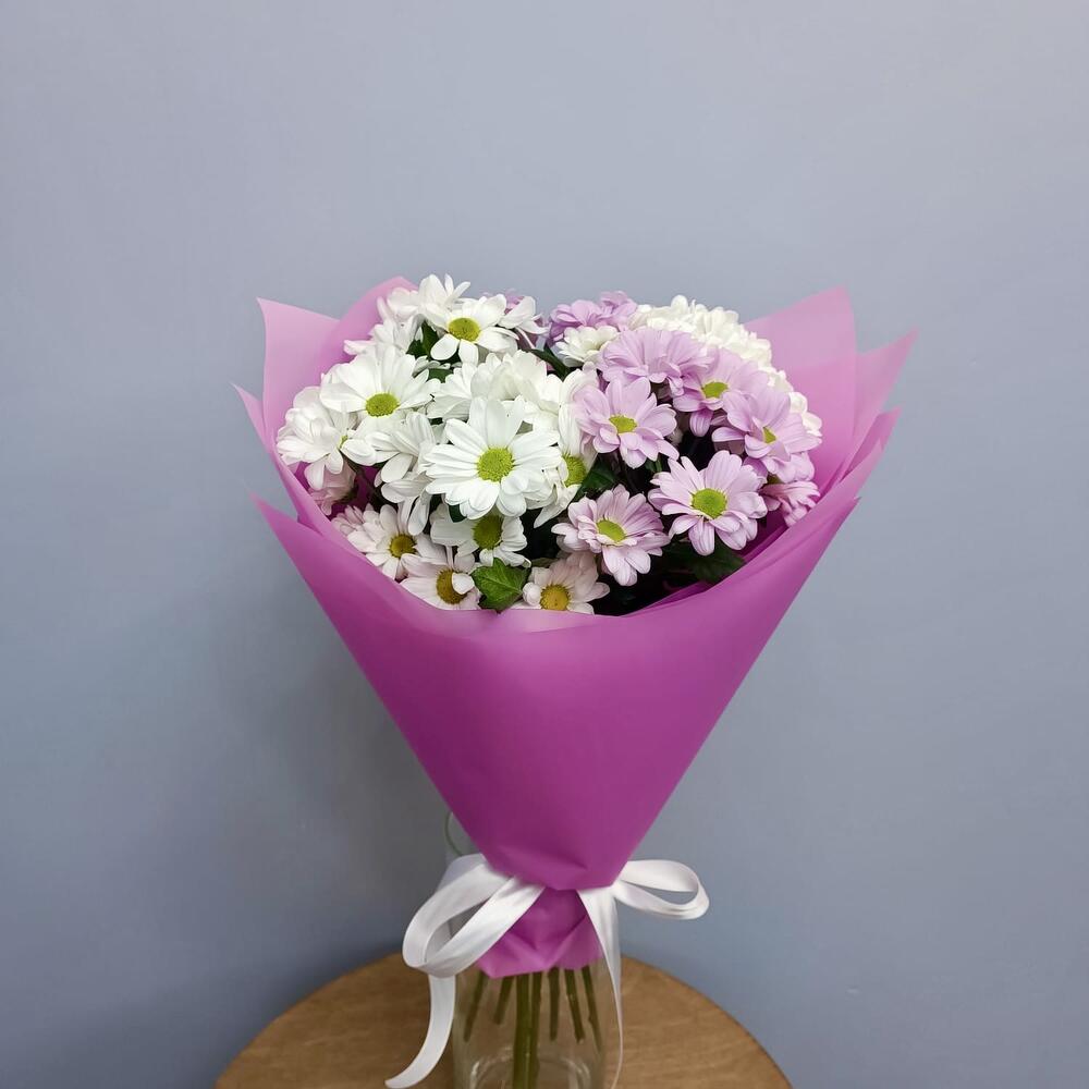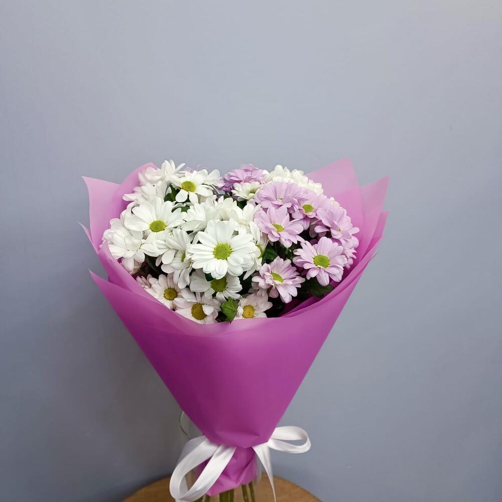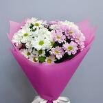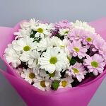 Этот букет из хризантем — это изысканная композиция, которая сочетает в себе нежность и элегантность. В букете представлены белые и розовые кустовые хризантемы, которые создают гармоничное сочетание цветов. Цветы аккуратно собраны и упакованы в яркую розовую бумагу, что придаёт букету праздничный и романтичный вид. Такой букет станет отличным подарком для любого случая, выражая искренние чувства и пожелания.