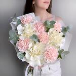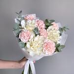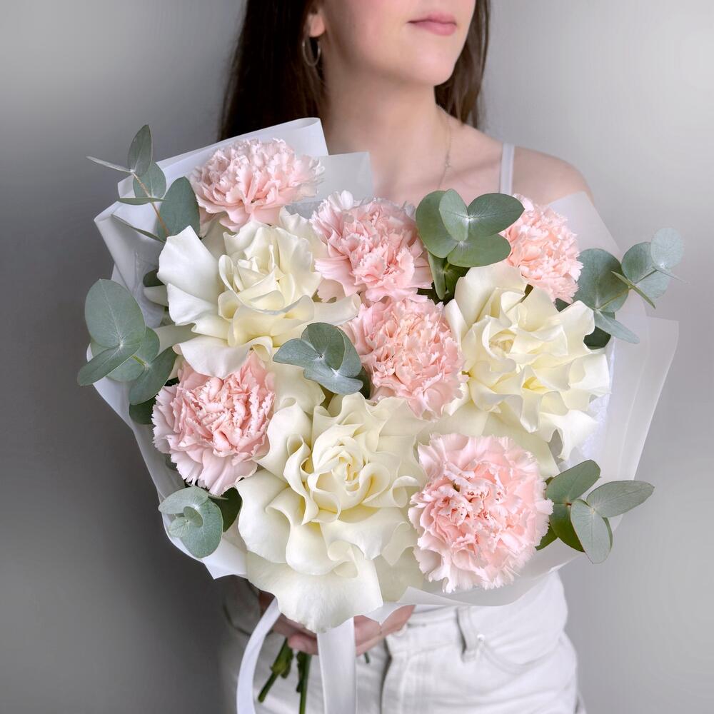 Нежный букет белая французская роза, розовый диантус и эвкалипт