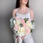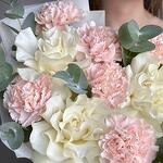 Нежный букет в пастельных тонах из белых французских роз, розового диантуса и эвкалипта :) Не забудьте подрезать цветы непосредственно перед тем как ставить в вазу (после подрезки в течении 2-3 секунд поставьте в воду). Не храните букет на прямых солнечных лучах и возле отопительных приборов, чтобы сохранить цветы свежими как можно дольше. Обратите внимание на размеры букета и фото в полный рост с человеком, для понимания размера композиции, это фото есть в карточке товара :)