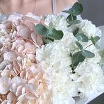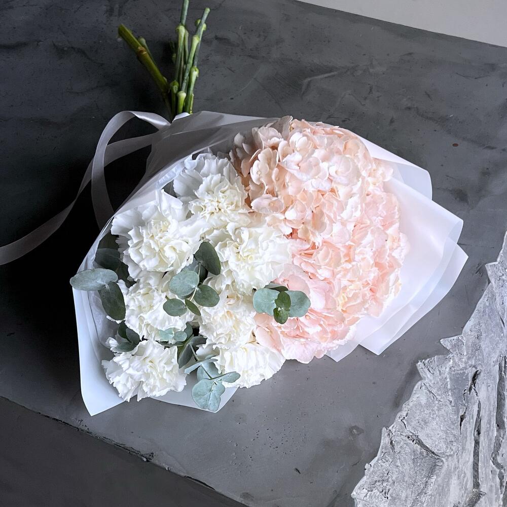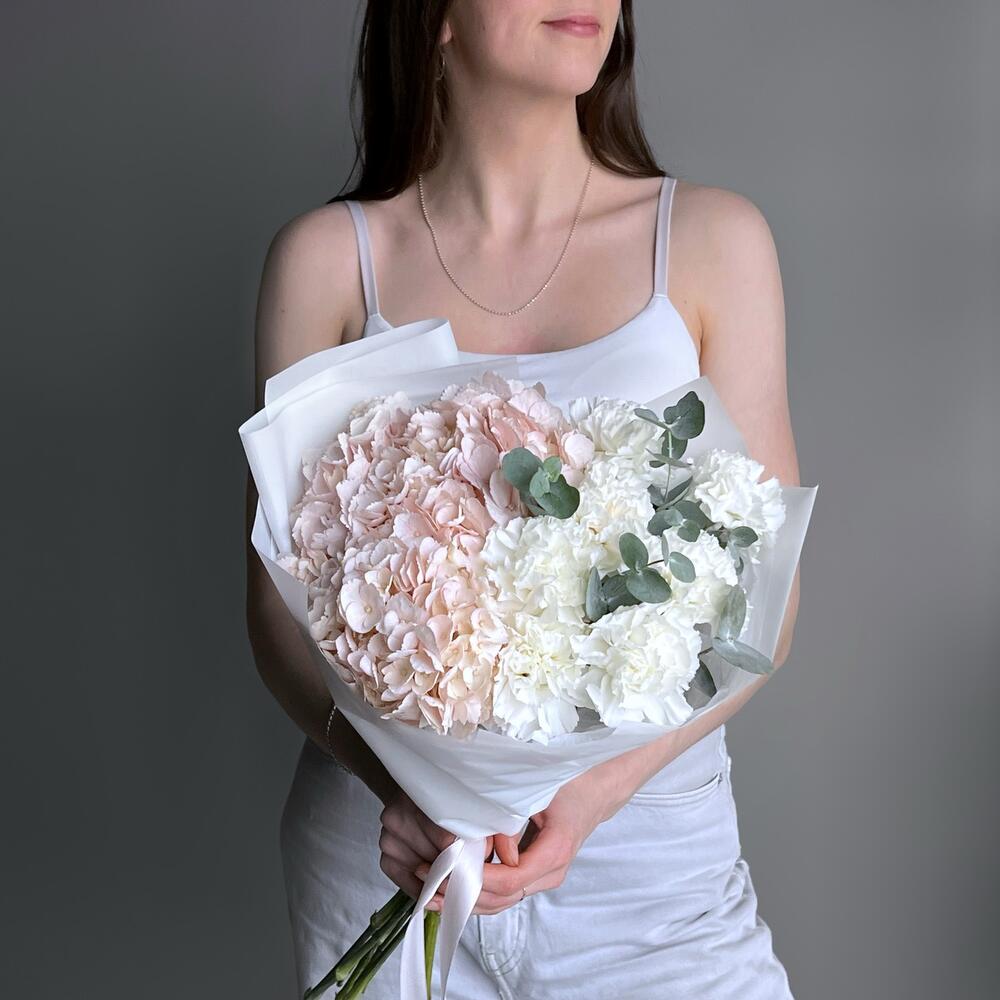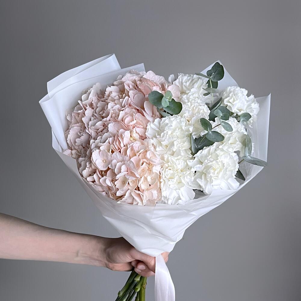 Нежный букет розовая гортензия, диантус и эвкалипт