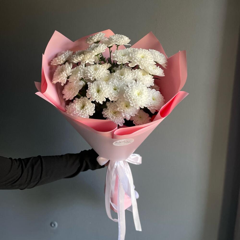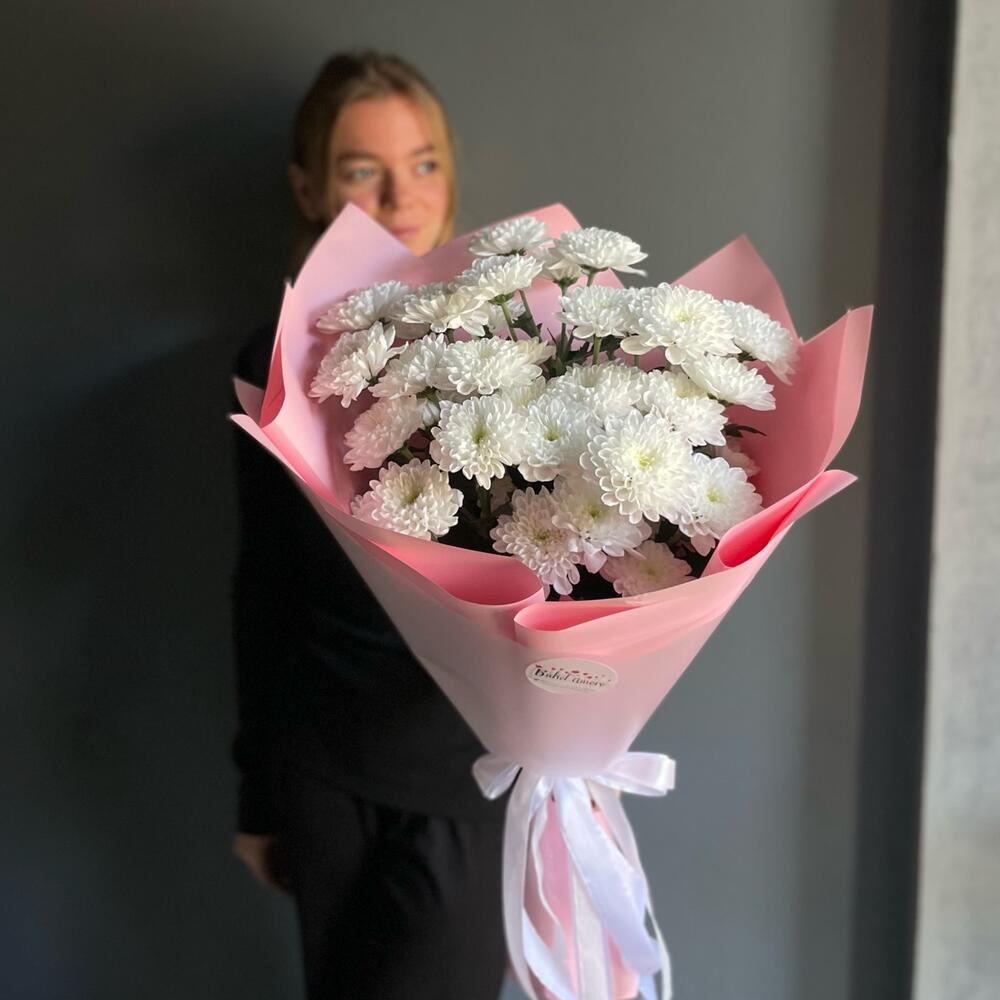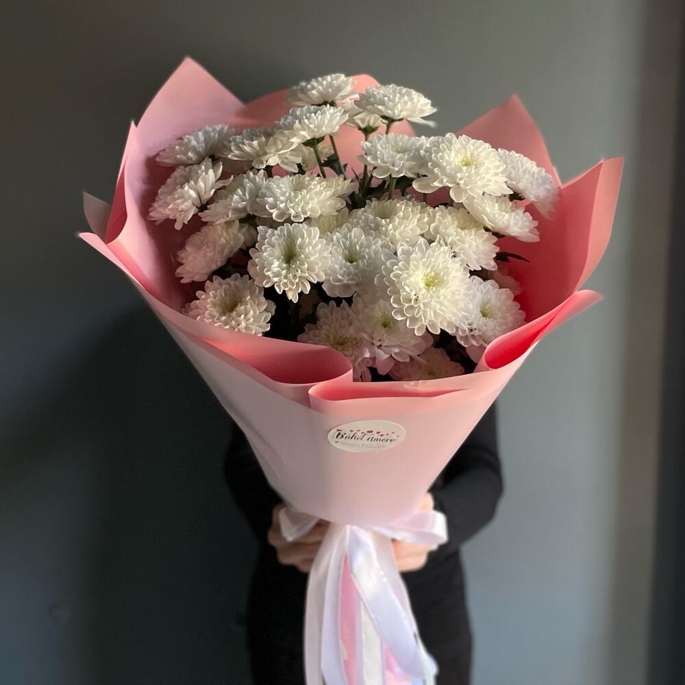 Хризантема кустовая Белая - 5 pz Упаковка дизайнерская - 6 pz Открыточка с вашими пожеланиями - 1 pz инструкция по уходу за цветами - 1 pz бант из атласной ленты - 1 pz