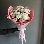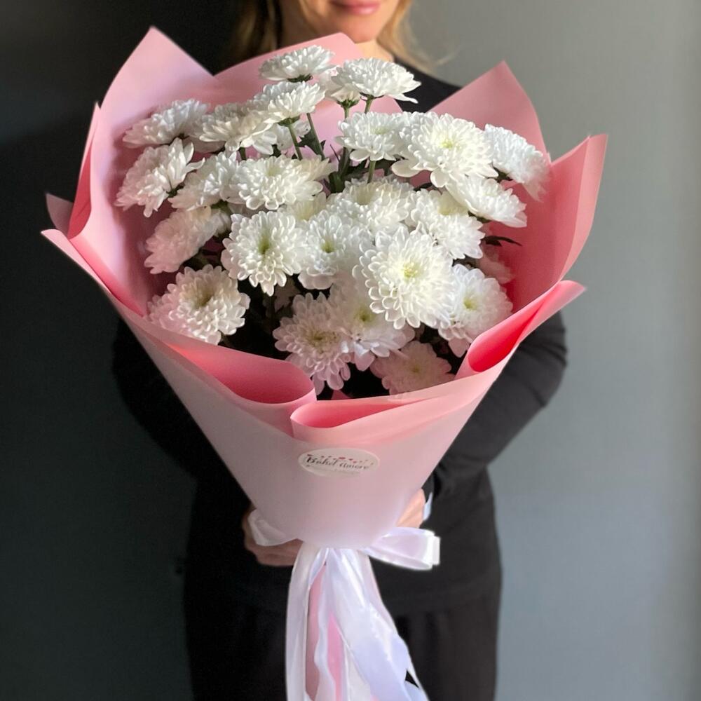 Букет из кустовой белой хризантемы в нежной розовой упаковке с добавлением белого пышного банта