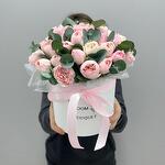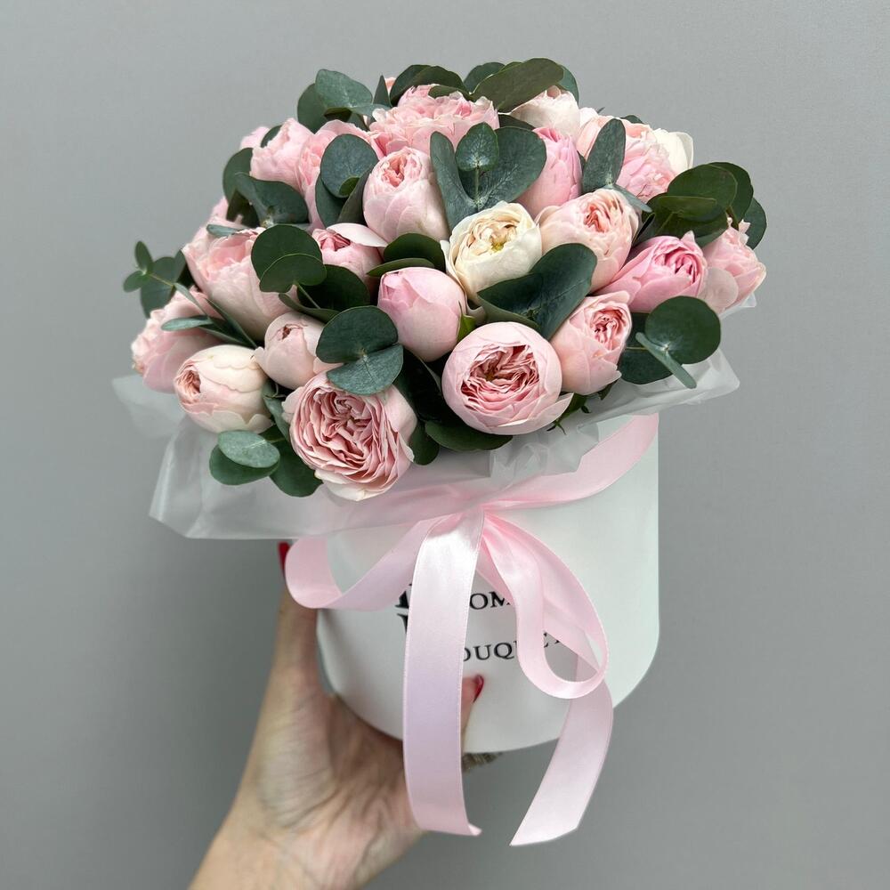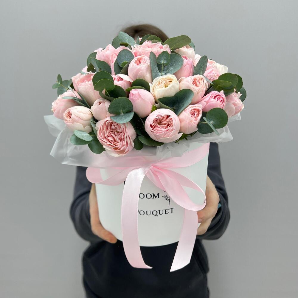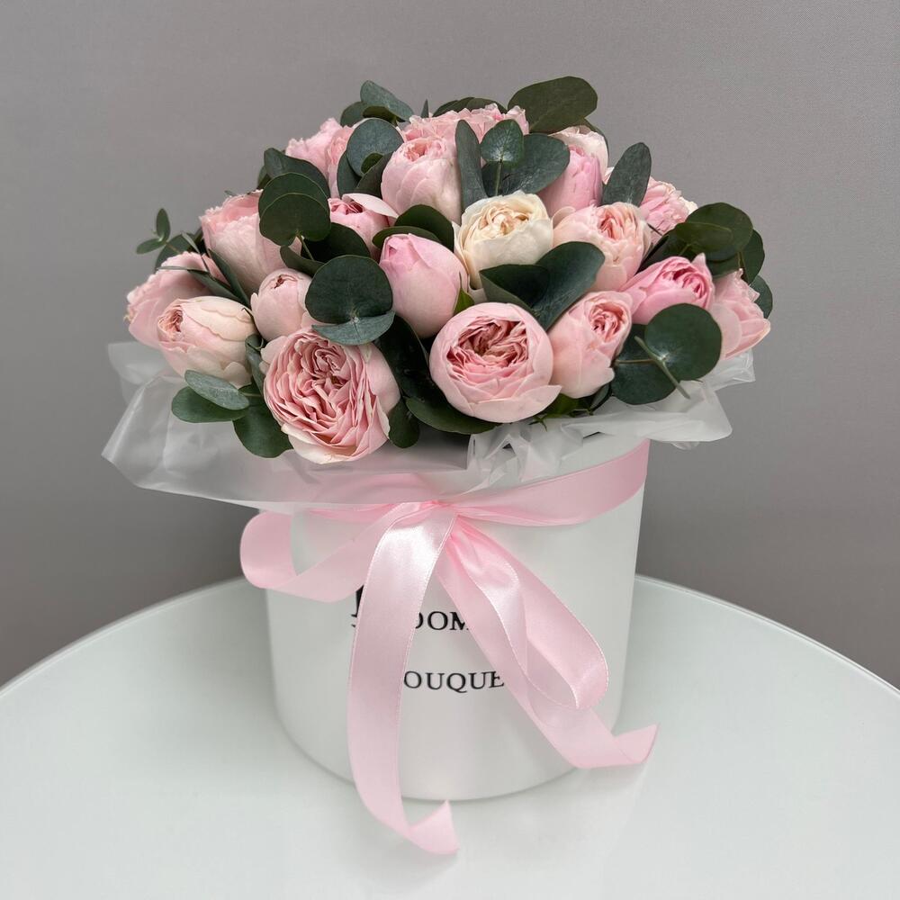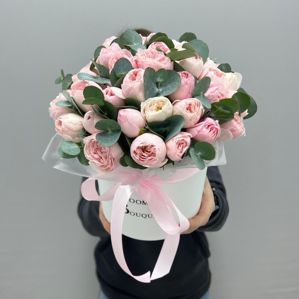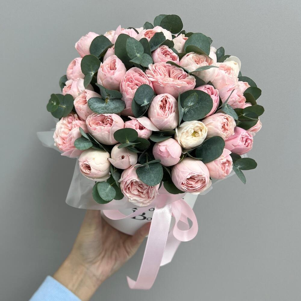 Коробка - 1 pz Роза кустовая пионовидная - 11 pz Оазис флористический - 1 pz эвкалипт ветка - 4 pz
