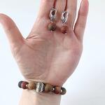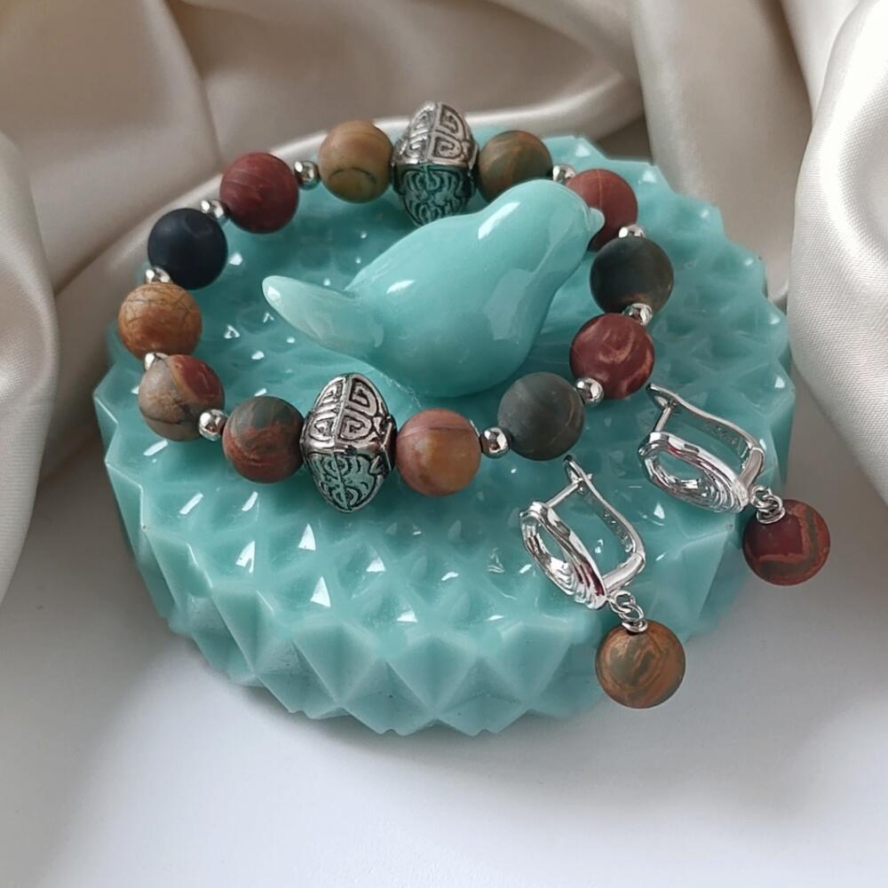 Комплект украшений браслет и серьги, индивидуального дизайна. Создан из красивых матовых бусин натуральной яшмы Пикассо. Размер бусин = 10 мм. Бусины яшмы Пикассо имеют красивые узоры в виде разных цветов и оттенков - от рыже-желтого до рыже-зеленого, которые созданы самой природой. Но самое интересное в этом камне - это его способность дать владельцу спокойствие и эмоциональную уверенность. С помощью украшения из яшмы Пикассо, Вы сможете устранять стресс, контролировать эмоции и успокоить свой разум. Яшма может подпитывать человека целебной позитивной энергией. И значит, очень важно на теле носить какое-либо изделие из этого красивого камушка. Яшма считается эффективным средством для избавления от бессонницы и улучшения памяти. Длина сережек = 3 см. Швензы выполнены из латуни с напылением родия, гипоаллергенны. Застежка - английский замок. Браслет выполнен на силиконовом амортизаторе. Для изящного запястья размером 15 см. Браслет и серьги приедут в подарочной коробочке. Будут хорошим подарком Вашей любимой девушке, дочке, сестре, подруге. Каждая коробочка хранит в себе специальную салфетку для ухода за украшением, индивидуальный мешочек для хранения украшения, милую открытку (выбирается рандомно) и небольшие комплименты) Чтобы Ваш заказ приехал без повреждений, я дополнительно упаковываю его в транспортировочный бокс и пакет из воздушно-пузырьковой пленки. Поэтому Вы можете быть уверены, что с ним все будет в порядке.