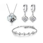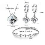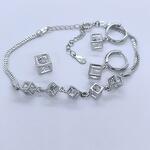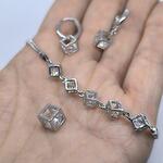 Комплект украшений из подвески ожерелья, серег и браслета. Чудесный серебряный комплект украшений в романтическом стиле. Дизайн украшений представляет собой кубики внутри которых помещены цирконы класса ААА в виде кристаллов с ярко выраженным блеском и переливами. Подвеска, серьги и браслет выполнены из тибетского серебра: состоящего из 40% серебра и 60% белой меди. Сверху изделия покрыты серебром 925 пробы и гипоаллергенны, что делает его прочным и стойким к внешним воздействиям. Этот набор женских украшений очарователен и не оставит вас равнодушным. Длина браслета: регулируется 17(+5) см. Размер колье: цепочка 46 см, кулон 0,8Х0,8 см. Высота сережек 2,5 см. Особенности Мы специализируемся на элитной, ювелирной бижутерии. Украшения выполнены из высококачественного бижутерного сплава с покрытием драгоценного металла. Изделия гипоаллергенны и благодаря премиальному качеству не теряют блеск со временем. Все комплекты поставляются в подарочной упаковке, это отличный вариант порадовать любимую женщину и всех женщин в преддверии 8 марта.
