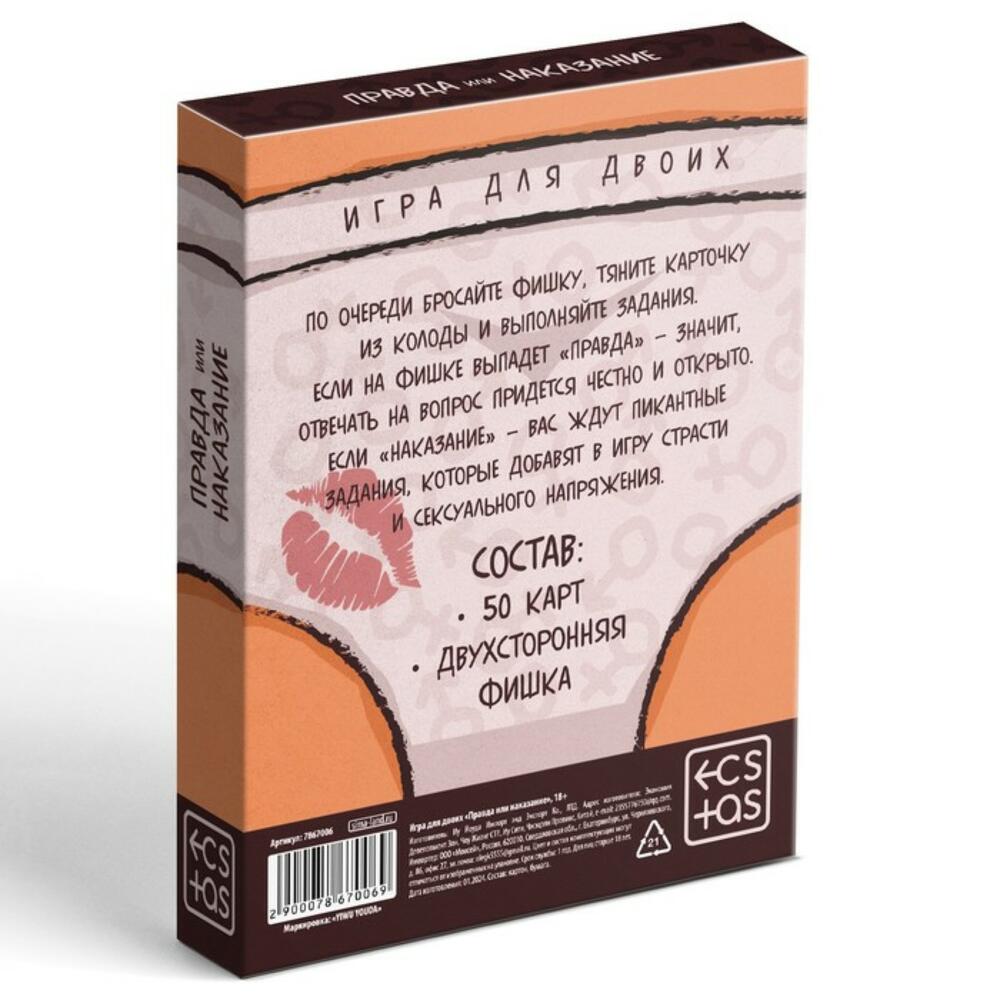 ПРАВДА или НАКАЗАНИЕ По очереди бросайте фишку. Тяните карточку из колоды. Выполняйте задания. Если на фишке выпадет «правда» - значит, отвечать на вопрос придется честно и открыто. Если «наказание» - вас ждут пикантные задания, которые добавят в игру страсти и сексуального напряжения. COCTAB: 50 карт двухсторонняя фишка