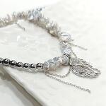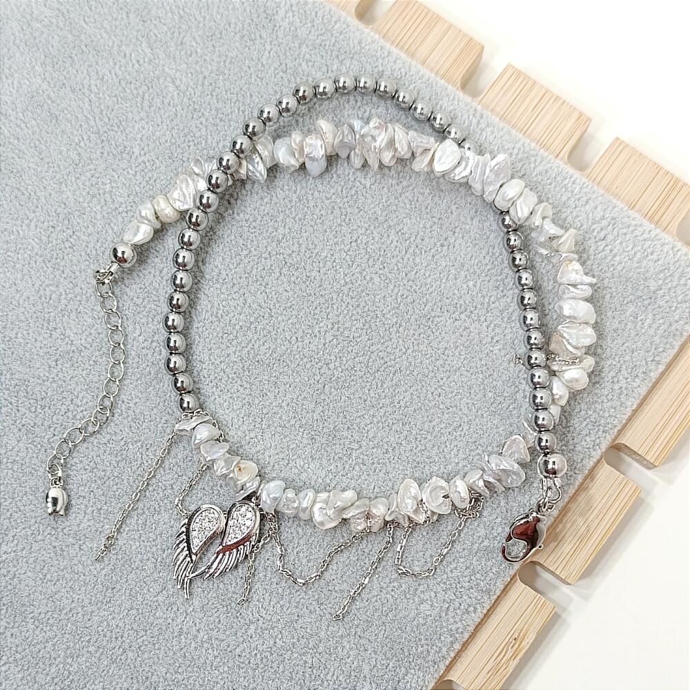 Трендовый серый ассимметричный чокер, индивидуального дизайна. Модный чокер-колье создан из натурального культивированного серого жемчуга ракушки и бусин гематина. Подвеска - крылья ангела инкрустирована фианитами. Вся фурнитура премиум качества - латунь родированная, гипоаллергенная. Застежка - карабин. Длина колье = 39см + 5см удлиннительная цепочка Размер бусин жемчуга ракушки = 6-7 мм Размер бусин гематина = 4 мм Модное колье приедет к Вам в подарочной коробочке. Будет хорошим подарком Вашей любимой девушке, жене, дочке, сестре, подруге. Каждая коробочка хранит в себе специальную салфетку для ухода за украшением, индивидуальный мешочек для хранения украшения, милую открытку (выбирается рандомно) и небольшой комплимент)